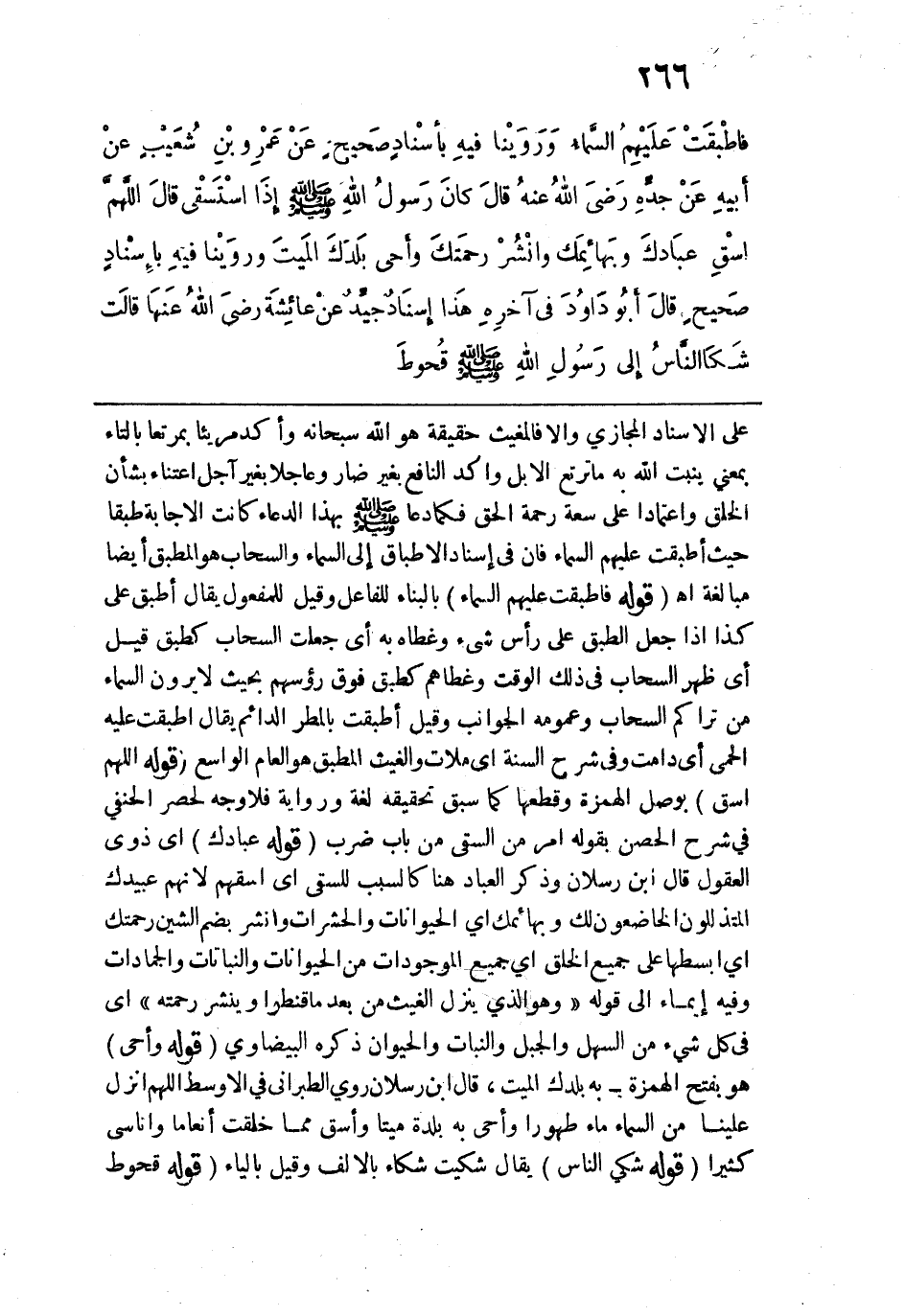 على الإسناد المجازي وإلَّا فالمغيث حقيقة هو الله سبحانه وأكد مريئًا بمرتعا بالتاء بمعنى ينبت الله به ما ترتع الإبل وأكد النافع بغير ضار وعاجلًا بغير آجل اعتناء بشأن الخلق واعتمادًا على سعة رحمة الحق فكما دعا - صلى الله عليه وسلم - بهذا الدعاء كانت الإجابة طبقًا حيث أطبقت عليهم السماء فإن في إسناد الأطباق إلى السماء والسحاب هو المطبق أيضًا مبالغ اهـ. قوله: (فأَطْبقَتْ عَلَيهِمُ السماء) بالبناء للفاعل وقيل للمفعول يقال أطبق على كذا إذا جعل الطبق على رأس شيء وغطاه به أي جعلت السحاب كطبق قيل أي ظهر السحاب في ذلك الوقت وغطاهم كطبق فوق رؤوسهم بحيث لا يرون السماء من تراكم السحاب وعمومه الجوانب وقيل أطبقت بالمطر الدائم يقال أطبقت عليه الحمى أي دامت وفي شرح السنة أي ملأت والغيث المطبق هو العام الواسع. قوله: (اللَّهمَّ اسْقِ) بوصل الهمزة وقطعها كما سبق تحقيقه لغة ورواية فلا وجه لحصر الحنفي في شرح الحصن بقوله أمر من السقي من باب ضرب. قوله: (عبَادكَ) أي ذوي العقول قال ابن رسلان وذكر العباد هنا كالسبب للسقي أي اسقهم لأنهم عبيدك المتذللون الخاضعون لك وبهائمك أي الحيوانات والحشرات وانشر بضم الشين رحمتك أي ابسطها على جميع الخلق أي جميع الموجودات من الحيوانات والنباتات والجمادات وفيه إيماء إلى قوله: {وَهُوَ الَّذِي يُنَزِّلُ الْغَيْثَ مِنْ بَعْدِ مَا قَنَطُوا وَيَنْشُرُ رَحْمَتَهُ} [الشورى: 28] أي في كل شيء من السهل والجبل والنبات والحيوان ذكره البيضاوي. قوله: (وأَحي) هو بفتح الهمزة به بلدك الميت، قال ابن رسلان روى الطبراني في الأوسط اللهم أنزل علينا من السماء ماءً طهورًا وأحي به بلدة ميتًا وأسق مما خلقت أنعاما وأناسي كثيرًا. قوله: (شَكَى النَّاسُ) يقال شكيت شكاء بالألف وقيل بالياء. قوله: (قُحوطَ