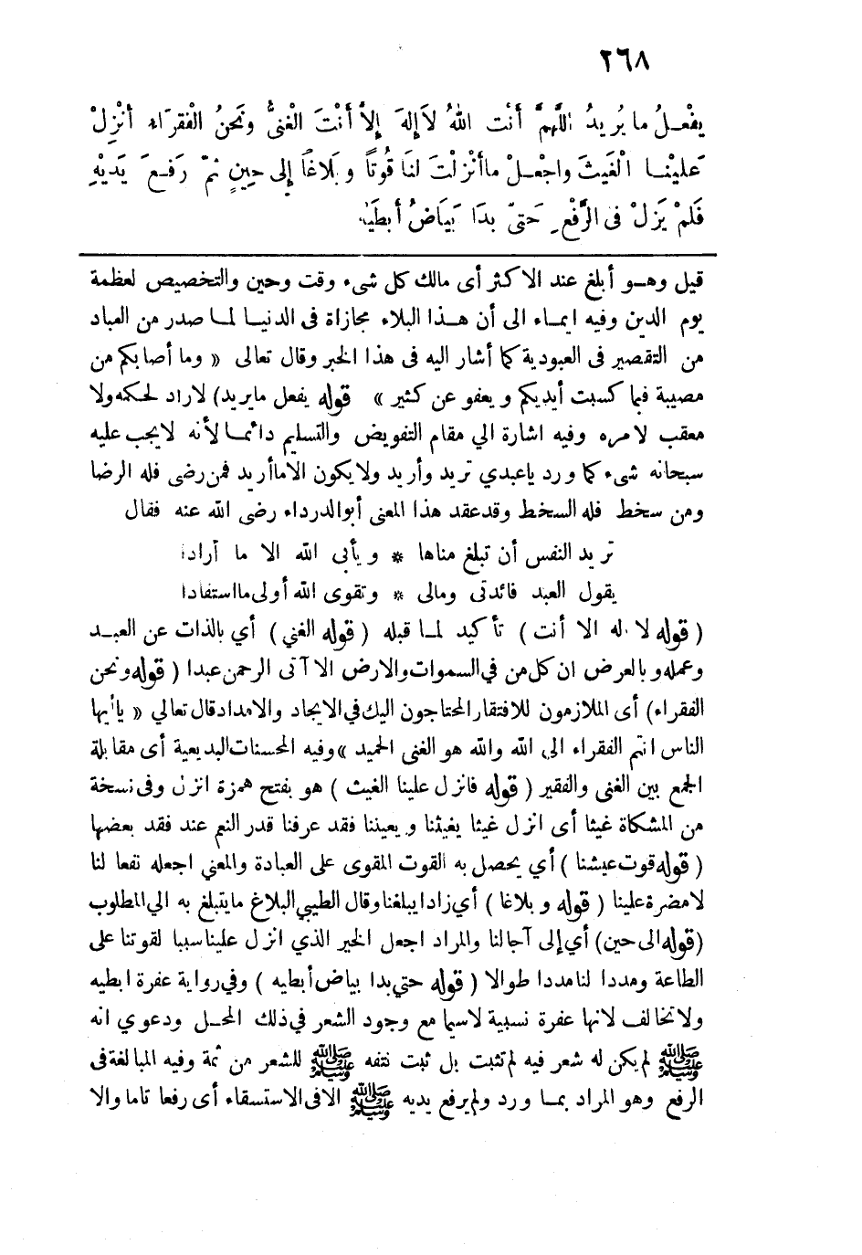 الحَمِيدُ} [فاطر: 15] وفيه المحسنات البديعية أي مقابلة الجمع بين الغني والفقير. قوله: (فأَنْزلْ عَليْنا الْغَيثَ) هو بفتح همزة أنزل وفي نسخة من المشكاة غيثا أي أنزل غيثا يغيثنا ويعيننا فقد عرفنا قدر النعم عند فقد بعضها. قوله: (قُوتَ عيشِنَا) أي يحصل به القوت المقوي على العبادة والمعنى اجعله نفعًا لنا لا مضرة علينا. قوله: (وبَلاغًا) أي زادا يبلغنا وقال الطيبي البلاغ ما يتبلغ به إلى المطلوب. قوله: (إِلى حِين) أي إلى آجالنا والمراد اجعل الخير الذي أنزل علينا سببًا لقوتنا على الطاعة ومددًا لنا مددًا طوَالًا. قوله: (حَتى بدَا بَيَاضُ إبطَيْه) وفي رواية عفرة إبطيه ولا تخالف لأنها عفرة نسبية لا سيما مع وجود الشعر في ذلك المحل ودعوى إنه - صلى الله عليه وسلم - لم يكن له شعر فيه لم تثبت بل ثبت نتفه - صلى الله عليه وسلم - للشعر من ثمة وفيه المبالغة في الرفع وهو المراد بما ورد ولم يرفع يديه - صلى الله عليه وسلم - إلّا في الاستسقاء أي رفعا تامًّا وإلَّا