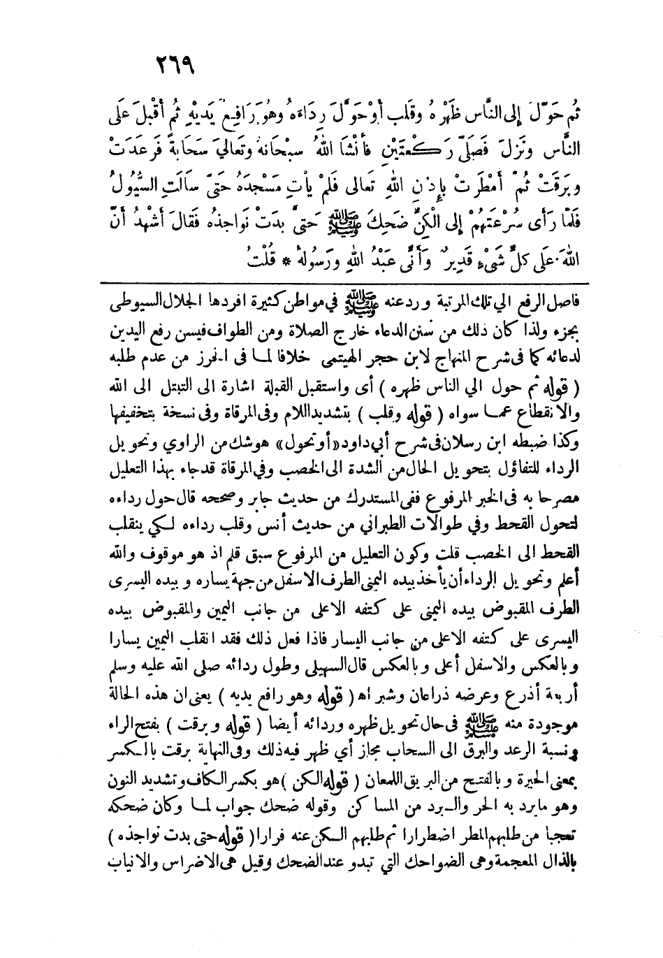 فاصل الرفع إلى تلك المرتبة ورد عنه - صلى الله عليه وسلم - في مواطن كثيرة أفردها الجلال السيوطي بجزء ولذا كان ذلك من سنن الدعاء خارج الصلاة ومن الطواف فيسن رفع اليدين لدعائه كما في شرح المنهاج لابن حجر الهيتمي خلافا لما في الحرز من عدم طلبه. قوله: (ثُم حَوّل إِلى النَّاس ظهْرهُ) أي واستقبل القبلة إشارة إلى التبتل إلى الله والانقطاع عما سواه. قوله: (وقَلب) بتشديد اللام وفي المرقاة وفي نسخة بتخفيفها وكذا ضبطه ابن رسلان في شرح أبي داود "أو تحول" هو شك من الراوي وتحويل الرداء للتفاؤل بتحويل الحال من الشدة إلى الخصب وفي المرقاة قد جاء بهذا التعليل مصرحًا به في الخبر المرفوع ففي المستدرك من حديث جابر وصححه قال حول رداءه لتحول القحط وفي طوالات الطبراني من حديث أنس وقلب رداءه لكي ينقلب القحط إلى الخصب قلت وكون التعليل من المرفوع سبق قلم إذ هو موقوف والله أعلم وتحويل الرداء أن يأخذ بيده اليمنى الطرف الأسفل من جهة يساره وبيده اليسرى الطرف المقبوض بيده اليمنى على كتفه الأعلى من جانب اليمين والمقبوض بيده اليسرى على كتفه الأعلى من جانب اليسار فإذا فعل ذلك فقد إنقلب اليمين يسارًا وبالعكس والأسفل أعلى وبالعكس قال السهيلي وطول ردائه - صلى الله عليه وسلم - أربعة أذرع وعرضه ذراعان وشبر اهـ. قوله: (وهُوَ رَافِع يَديْهِ) يعني إن هذه الحالة موجودة منه - صلى الله عليه وسلم - في حال تحويل ظهره وردائه أيضًا. قوله: (وبَرقَتْ) بفتح الراء ونسبة الرعد والبرق إلى السحاب مجاز أي ظهر فيه ذلك وفي النهاية برقت بالكسر بمعنى الحيرة وبالفتح من البريق اللمعان. قوله: (الْكِنِّ) هو بكسر الكاف وتشديد النون وهو ما يرد به الحر والبرد من المساكن وقوله ضحك جواب لما وكان ضحكه تعجبًا من طلبهم المطر اضطرارا ثم طلبهم الكن عنه فرارا. قوله: (حَتي بدَتْ نَواجذُه) بالذال المعجمة وهي الضواحك التي تبدو عند الضحك وقيل هي الأضراس والأنياب