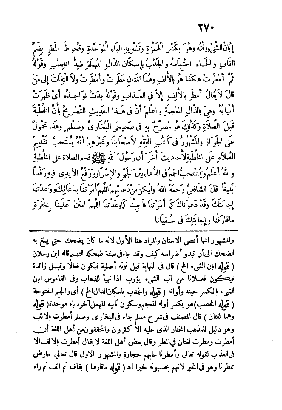 والمراد هنا الأول لأنه ما كان يضحك حتى يبلغ به الضحك إلى أن تبدو أضراسه كيف وقد جاء في صفة ضحكه التبسم قاله ابن رسلان. قوله: (إبانُ الشَّيْءِ الخ) قال في النهاية قيل نونه أصلية فيكون فعالا وقيل زائدة فيكون فعلانا من آب الشيء يؤوب إذا تهيأ للذهاب وفي القاموس إبان الشيء بالكسر حينه وأوانه. قوله: (والجَدْبُ بإِسكَان الذالِ الخ) أي والجيم المفتوحة. قوله: (الخِصب) هو بكسر أوله المعجم وسكون ثانيه المهمل آخره باء موحدة. قوله: (وهُمَا لغتَانِ) قال المصنف في شرح مسلم جاء في البخاري ومسلم أمطرت بالألف وهو دليل للمذهب المختار الذي عليه الأكثرون والمحققون من أهل اللغة أن أمطرت ومطرت لغتان في المطر وقال بعض أهل اللغة لا يقال أمطرت بالألف إلَّا في العذاب لقوله تعالى: (وَأَمطَرْنَا عَلَيهم حِجَارَة) [الحجر: 74] والمشهور الأول قال تعالى عارض ممطرنا وهو في الخير لأنهم يحسبونه خيرًا اهـ. قوله: (ما قارَفْنا) بقاف ثم ألف ثم راء