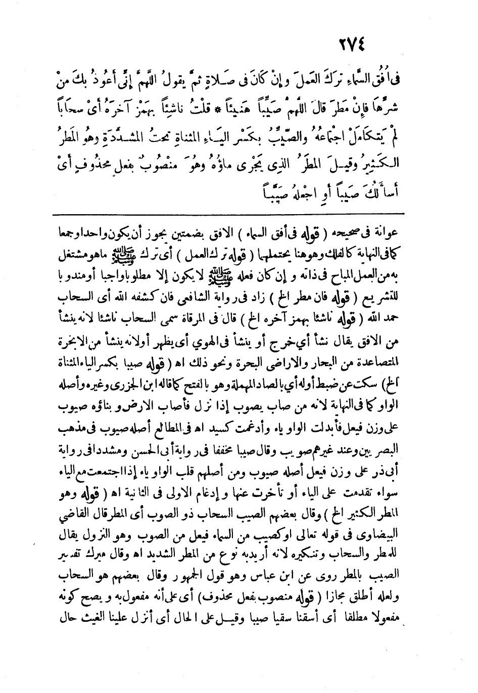 كان فعله - صلى الله عليه وسلم - لا يكون إلَّا مطلوبًا واجبًا أو مندوبًا للتشريع. قوله: (فإِنْ مَطرَ الخ) زاد في رواية الشافعي فإن كشفه الله أي السحاب حمد الله. قوله: (ناشِئًا بهَمْز آخرَهُ الخ) قال في المرقاة سمي السحاب ناشئًا لأنه ينشأ من الأفق يقال نشأ أي خرج أو ينشأ في الهوى أي يظهر أو لأنه ينشأ من الأبخرة المتصاعدة من البحار والأراضي البحرة ونحو ذلك اهـ. قوله: (صيبًا بكَسْر اليَاءِ المثناةِ الخ) سكت عن ضبط أوله أي بالصاد المهملة وهو بالفتح كما قاله ابن الجزري وغيره وأصله الواو كما في النهاية لأنه من صاب يصوب إذا نزل فأصاب الأرض وبناؤه صيوب على وزن فيعل فأبدلت الواو ياء وأدعمت كسيد اهـ. في المطالع أصله صيوب في مذهب البصريين وعند غيرهم صويب وقال صيبًا مخففا في رواية أبي الحسن ومشددا في رواية أبي ذر على وزن فيعل أصله صيوب ومن أصلهم قلب الواو ياء إذا اجتمعت مع الياء سواء تقدمت على الياء أو تأخرت عنها وإدعام الأولى في الثانية اهـ. قوله: (وهُو المطرُ الكِثيرُ الخ) وقال بعضهم الصيب السحاب ذو الصوب أي المطر قال القاضي البيضاوي في قوله تعالى: {أَوْ كَصَيِّبٍ مِنَ السَّمَاءِ} [البقرة: 19]، فيعل من الصوب وهو النزول يقال للمطر والسحاب وتنكيره لأنه أريد به نوع من المطر الشديد اهـ، وقال ميرك تفسير الصيب بالمطر روي عن ابن عباس وهو قول الجمهور وقال بعضهم هو السحاب ولعله أطلق مجازًا. قوله: (منْصُوبٌ بفعل محذُوفٍ) أي على أنه مفعول به ويصح كونه مفعولًا مطلقًا أي اسقنا سقيًا صيبًا وقيل على الحال أي أنزل علينا الغيث حال
