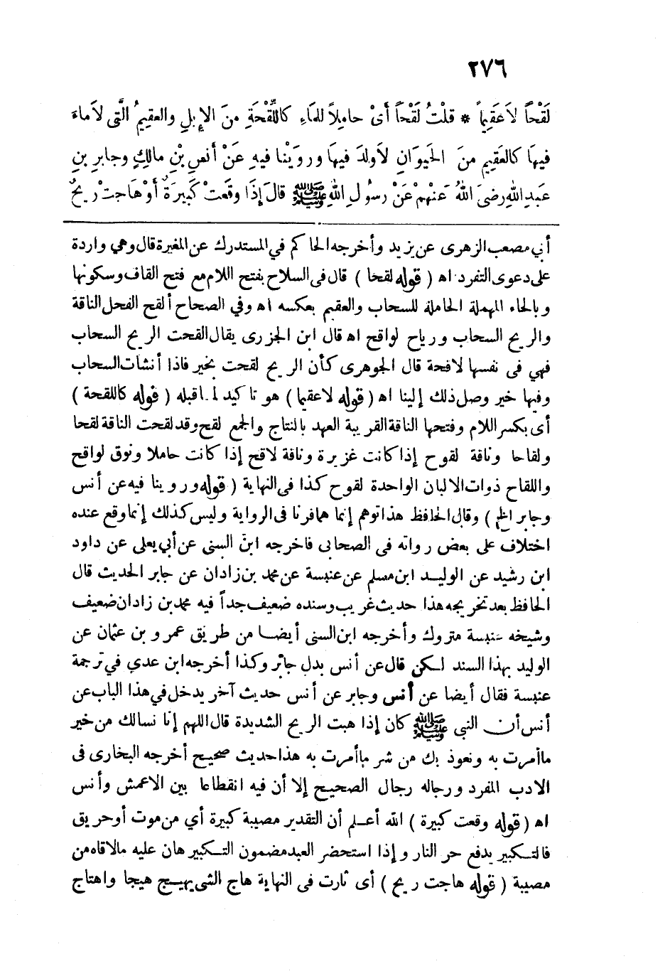 أبي مصعب الزهري عن يزيد وأخرجه الحاكم في المستدرك عن المغيرة قال وهي واردة على دعوة التفرد اهـ. قوله: (لقْحًا) قال في السلاح بفتح اللام مع فتح القاف وسكونها وبالحاء المهملة الحاملة للسحاب والعقيم بعكسه اهـ، وفي الصحاح ألقى الفحل الناقة والريح السحاب ورياح لواقح اهـ. قال ابن الجزري يقال القحت الريح السحاب فيه في نفسها لاقحة قال الجوهري كأن الريح لقحت بخير فإذا أنشأت السحاب وفيها خير وصل ذلك إلينا اهـ. قوله: (لَا عَقِيمًا) هو تأكيد لما قبله. قوله: (كاللقْحَةِ) أي بكسر اللام وفتحها الناقة القريبة العهد بالنتاج والجمع لقح وقد لقحت الناقة لقحا ولقاحا وناقة لقوح إذا كانت غزيرة وناقة لاقح إذا كانت حاملا ونوق لواقح واللقاح ذوات الألبان الواحدة لقوح كذا في النهاية. قوله: (وَرَوَيْنَا فيهِ عَنْ أَنسٍ وجابرٍ الخ) وقال الحافظ هذا توهم إنما هما قرنا في الرواية وليس كذلك إنما وقع عنده اختلاف على بعض رواته في الصحابي فأخرجه ابن السني عن أبي يعلى عن داود بن رشيد عن الوليد بن مسلم عن عنبسة عن محمد بن زادان عن جابر الحديث قال الحافظ بعد تخريجه هذا حديث غريب وسنده ضعيف جدًّا فيه محمد بن زادان ضعيف وشيخه عنبسة متروك وأخرجه ابن السني أيضًا من طريق عمرو بن عثمان عن الوليد بهذا السند لكن قال عن أنس بدل جابر وكذا أخرجه ابن عدي في ترجمة عنبسة فقال أيضًا عن أنس وجابر عن أنس حديث آخر يدخل في هذا الباب عن أنس أن النبي - صلى الله عليه وسلم - كان إذا هبت الريح الشديدة قال اللهم إنا نسألك من خير ما أمرت به ونعوذ بك من شر ما أمرت به هذا حديث صحيح أخرجه البخاري في الأدب المفرد ورجاله رجال الصحيح إلَّا أن فيه انقطاعا بين الأعمش وانس اهـ. قوله: (وقَعتْ كَبيرَةٌ) الله أعلم أن التقدير مصيبة كبيرة أي من موت أو حريق فالتكبير يدفع حر النار وإذا استحضر العبد مضمون التكبير هان عليه ما لاقاه من مصيبة. قوله: (هَاجتْ ريحٌ) أي ثارت في النهاية هاج الشيء يهيج هيجا واهتاج