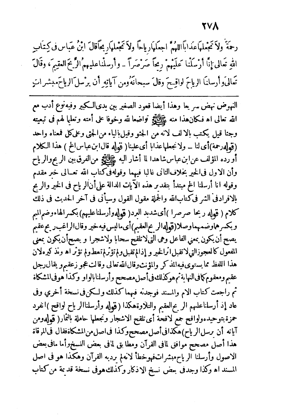 أن يكون بمعنى المفعول كالعجوز التي لا تقبل أثر الخير وإذا لم تقبل ولم تؤثر لم تعط ولم تؤثر اهـ، وتذكيره لأن هذا اللفظ مما يستوي فيه المذكر والمؤنث وقال الله تعالى: {وَقَالتْ عَجُوزٌ عَقِيمٌ} [الذاريات: 29] ويقال رجل عقيم ومعقوم كما في النهاية ثم هو كذلك في أصل مصحح وأرسلنا بالواو وكذا هو في المشكاة ثم راجعت كتاب الأم المسند فوجدته فيهما كذلك ولكن في نسخة أخرى وفي عاد إذ أرسلنا عليهم الريح العقيم والتلاوة هكذا. قوله: {وَأَرْسَلْنَا الرِّيَاحَ لَوَاقِحَ} [الحجر: 22] انفرد حمزة بتوحيده ولواقح جمع لاقحة أي تلقح الأشجار وتجعلها حاملة بالثمار. قوله: (ومن آياتِهِ أَن يرْسلَ الرياحَ) هكذا في أصل مصحح وكذا في أصل من المشكاة فقال في المرقاة هذا أصل مصحح موافق لما في القرآن ومطابق لما في بعض النسخ وأما ما في بعض الأصول وأرسلنا الرياح مبشرات فهو خطأ لأنه لم يرد به القرآن وهذا هو في أصل المسند اهـ، وكذا وجد في بعض نسخ الأذكار وكذلك هو في نسخة قديمة من كتاب