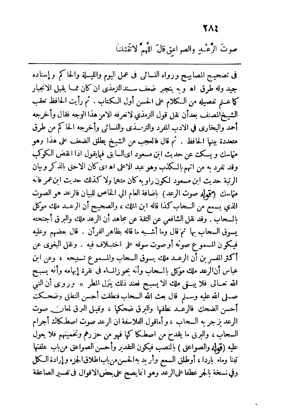 الكتاب. ثم رأيت الحافظ تعقب الشيخ المصنف بعد أن نقل قول الترمذي لا نعرف إلَّا من هذا الوجه فقال وأخرجه أحمد والبخاري في الأدب المفرد والترمذي والنسائي وأخرجه الحاكم من طرق متعددة بينها الحافظ. ثم قال فالعجب من الشيخ يطلق الضعف على هذا وهو متماسك ويسكت عن حديث ابن مسعود أي السابق فيما يقول إذا انقض الكوكب وقد تفرد به من اتهم بالكذب وهو عبد الأعلى اهـ. أي كان الأحق بالذكر وبيان الرتبة حديث ابن مسعود لكون راويه كان متهمًا ولا كذلك حديث ابن عمر فإنه متماسك. قوله: (صوتَ الرَّعْدِ) بإضافة العام إلى الخاص للبيان فالرعد هو الصوت الذي يسمع من السحاب كذا قاله ابن الملك، والصحيح أن الرعد ملك موكل بالسحاب. وقد نقل الشافعي عن الثقة عن مجاهد أن الرعد ملك والبرق أجنحته يسوق السحاب بها ثم قال وما أشبه ما قاله بظاهر القرآن. قال بعضهم وعليه فيكون المسموع صوته أو صوت سوقه على اختلاف فيه. ونقل البغوي عن أكثر المفسرين أن الرعد ملك يسوق السحاب والمسموع تسبيحه، وعن ابن عباس أن الرعد ملك موكل بالسحاب وأنه يجوز الماء في نقرة إبهامه وأنه يسبح الله تعالى فلا يبقى ملك إلَّا يسبح فعند ذلك ينزل المطر.