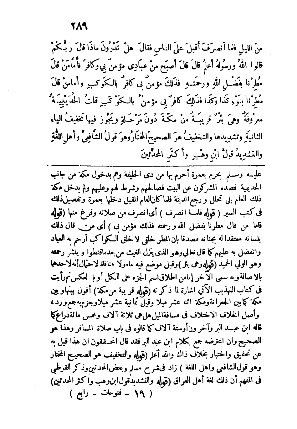عليه وسلم - يحرم بعمرة أحرم بها من ذي الحليفة وهم بدخول مكة من جانب الحديبية فصده المشركون عن البيت فصالحهم وشرط لهم وعليهم ولم يدخل مكة ذلك العام بل تحلل ورجع المدينة فلما كان العام المقبل دخلها بعمرة وتفصيل ذلك في كتب السير. قوله: (فلمَّا انصرَفَ) أي انصرف من صلاته وفرع منها. قوله: (فأمَّا مَنْ قَال مُطِرنَا بفَضْلِ الله ورحمتَهِ فذَلِكَ مؤمنٌ بِي) أي من قال ذلك بلسانه معتقدا له بجنانه مصدقًا بأن المظر خلقي لا خلق الكواكب أرحم به العباد وأتفضل به عليهم كما قال تعالى: {وَهُوَ الَّذِي يُنَزِّلُ الْغَيْثَ مِنْ بَعْدِ مَا قَنَطُوا وَيَنْشُرُ رَحْمَتَهُ وَهُوَ الْوَلِيُّ الْحَمِيدُ} [الشورى: 28]. قوله: (وهيَ بئْرٌ) وقيل موضع فيه ماء ولا منافاة لاحتمال أنه لأحدهما بالأصالة وبه سمي الآخر إما من إطلاق اسم الجزء على الكل أو بالعكس ثم رأيت في كتاب التهذيب الآتي إشارة لما ذكرته. قوله: (قريبَةٌ منْ مكّةَ) أقول بينها وبين مكة كما بين الجعرانة ومكة اثنا عشر ميلًا وقيل ثمانية عشر ميلًا وجزم به جمع ورد، وأصل الخلاف الاختلاف في مسافة الميل هل هي ثلاثة آلاف وخمسمائة ذراع كما قاله ابن عبد البر وآخرون أو ستة آلاف كما قالوه في باب صلاة المسافر وهذا هو الصحيح وإن اعترضه جمع بكلام ابن عبد البر فقد قال المحققون إن هذا قيل به عن تحقيق واختبار بخلاف ذاك والله أعلم. قوله: (والتخفيفُ هو الصحيحُ المختَارُ وهوَ قولُ الشَّافِعي وأَهلِ اللُّغةِ) زاد في شرح مسلم وبعض المحدثين وذكر القرطبي في المفهم أن ذلك لغة أهل العراق. قوله: (والتشدِيدُ قولُ ابْنِ وهْب وأَكثَرِ المحدِّثينَ)