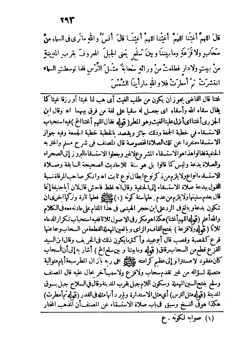غثنا قال القاضي يجوز أن يكون من طلب الغيث أي هب لنا غيثًا أو رزقًا غيثا كما يقال سقاه الله وأسقاه أي جعل له سقيًا على لغة من فرق بينهما اهـ. وقال ابن الجزري أغثنا أي أنزل علينا الغيث وهو المطر. قوله: (فقَال اللهُم أَغِثْنا الخ) فيه استحباب الاستسقاء في خطبة الجمعة وذلك جائز ولقصد بالخطبة خطبة الجمعة وفيه جواز الاستسقاء منفردًا عن تلك الصلاة المخصوصة قال المصنف في شرح مسلم واغتربه الحنفية فقالوا هذا هو الاستسقاء المشروع لا غير وجعلوا الاستسقاء البروز إلى الصحراء والصلاة بدعة وليس كما قالوا بل هو سنة للأحاديث الصحيحة السابقة وصلاة الاستسقاء أنواع ولا يلزم من ذكر نوع إبطال نوع ثابت اهـ، وأنكر صاحب المرقاة نسبة القول ببدعة صلاة الاستسقاء إلى الحنفية وقال إنه غلط فاحش قال لأن أبا حنيفة إنما قال بعدم سنيتها ولا يلزم من عدم جعلها سنة كونه - صلى الله عليه وسلم - فعلها تارة وتركها أخرى أن تكون بدعة وبالغ في الرد على ابن حجر الهيتمي في هذا المقام على عادته معه في الكلام والله أعلم. قوله: (اللَّهمَّ أغِثنَا) هكذا هو مكرر في الأصول ثلاثًا ففيه استحباب تكرار الدعاء ثلاثًا. قوله: (ولا قَزَعَةٍ) بفتح القاف والزاي وبالعين المهملة القطعة من السحاب وجماعتها قرع كقصبة وقصب قال أبو عبيد وأكثر ما يكون ذلك في الخريف وقال ابن السيد القزع قطع من السحاب رقاق. قوله: (ومَا بيننَا وبينَ سَلْع الخ) أشار به إلى أن السحاب كان مفقودًا لا مستترًا وإلى عظيم كرامته - صلى الله عليه وسلم - على ربه بإنزال المطر سبعة أيام متوالية متصلة لسؤاله من غير تقدم سحاب ولا فزع ولا سبب آخر يحال عليه قال المصنف وسلع بفتح السين المهملة وسكون اللام جبل بقرب المدينة وقال في السلاح جبل بسوق المدينة. قوله: (مثْلَ الترْسِ) أي مثل الاستدارة ولم يرد أنها مثله في القدر. قوله: (ثم أمطرَتْ) هكذا هو في النسخ وسبق في باب صلاة الاستسقاء عن المصنف أن المذهب المختار
