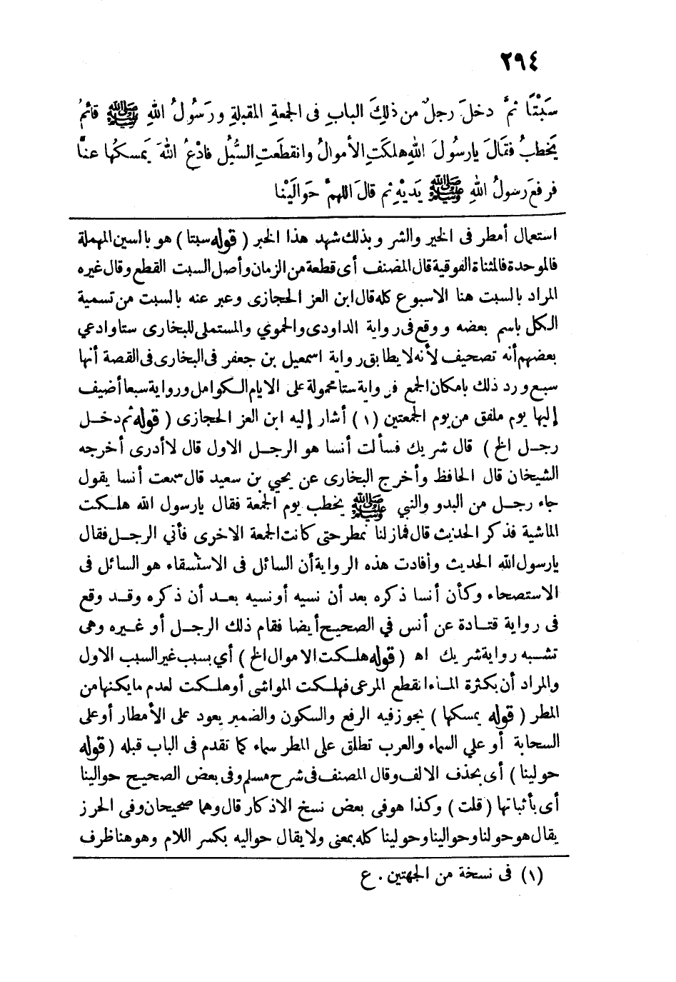 أن نسيه أو نسيه بعد أن ذكره وقد وقع في رواية قتادة عن أنس في الصحيح أيضًا فقام ذلك الرجل أو غيره وهي تشبه رواية شريك اهـ. قوله: (هلكَتِ الأَموالُ الخ) أي بسبب غير السبب الأول والمراد أن بكثرة الماء انقطع المرعى فهلكت المواشي أو هلكت لعدم ما يكنها من المطر. قوله: (يَمسكُها) يجوز فيه الرفع والسكون والضمير يعود الأمطار أو على السحابة أو على السماء والعرب تطلق على المطر سماء كما تقدم في الباب قبله. قوله: (حَولَيْنا) أي بحذف الألف وقال المصنف في شرح مسلم وفي بعض الصحيح حوالينا أي بإثباتها (قلت) وكذا هو في بعض نسخ الأذكار قال وهما صحيحان وفي الحرز يقال هو حولنا وحوالينا وحولينا كله بمعنى ولا يقال حواليه بكسر اللام وهو هنا ظرف