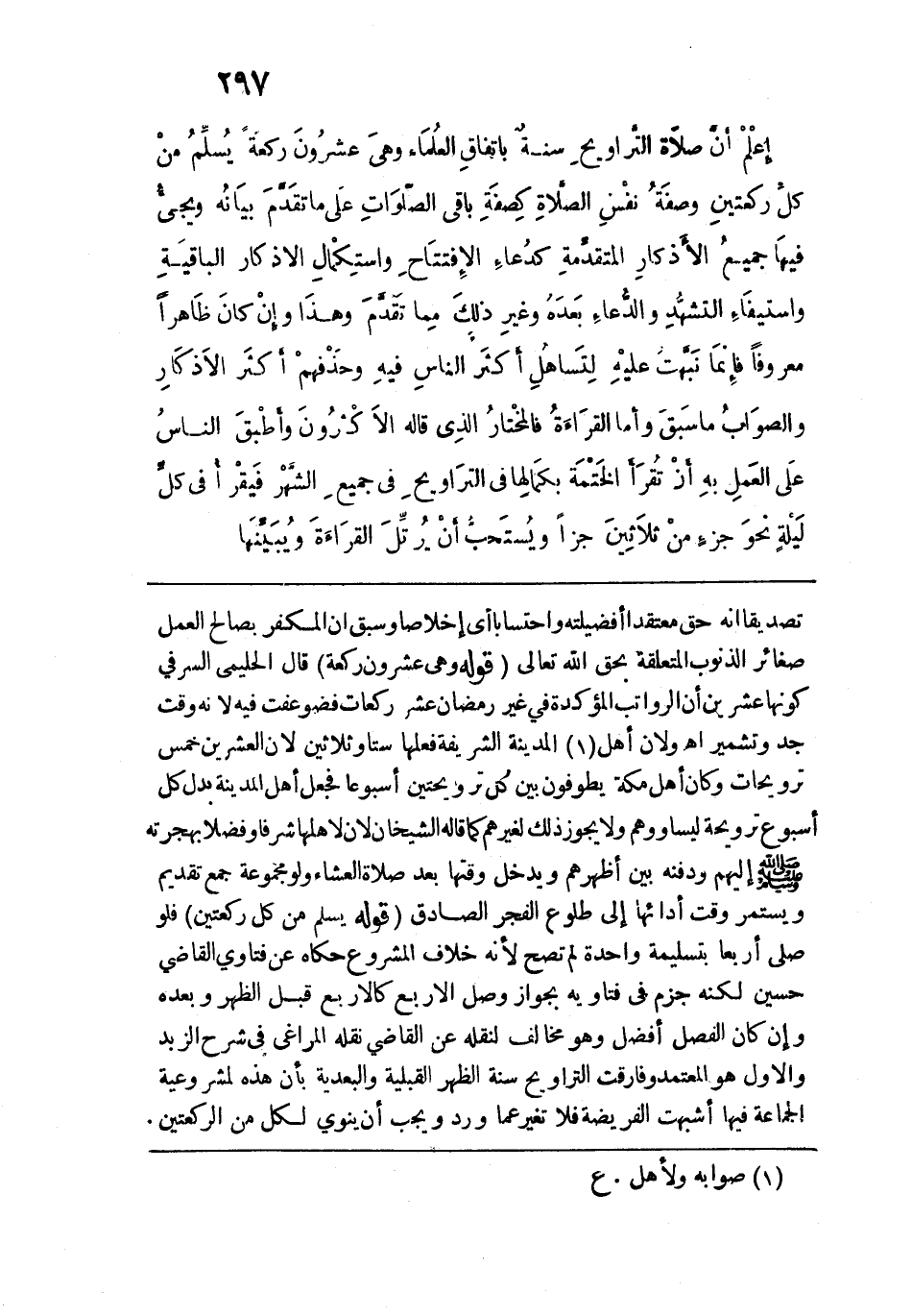 اعلم أن صلاة التراويح سُنَّة باتفاق العلماء، وهي عشرون ركعة، يسلِّم من كل ركعتين، وصفة نفس الصلاة كصفة باقي الصلوات على ما تقدَّم بيانه، ويجيء فيها جميع الأذكار المتقدِّمة كدعاء الافتتاح، واستكمال الأذكار الباقية، واستيفاء التشهد، والدُّعاء بعده، وغير ذلك مما تقدَّم، وهذا وإن كان ظاهرًا معروفًا، فإنما نبهت عليه لتساهل أكثر النّاس فيه، وحذفهم أكثر الأذكار، والصواب ما سبق.