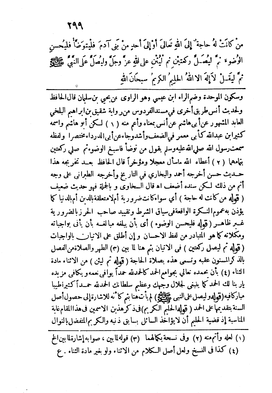 ومؤخرا قال الحافظ بعد تخريجه هذا حديث حسن أخرجه أحمد والبخاري في التاريخ وأخرجه الطبراني على وجه أتم من ذلك لكن سنده أضعف اهـ. قال السخاوي وبالجملة فهو حديث ضعيف. قوله: (منْ كانَتْ لهُ حاجةٌ) أي سواء كانت ضرورية أم لا متعلقة بالدين أم بالدنيا كما يؤذن به عموم النكرة الواقعة في سياق الشرط وتقييد صاحب الحرز بالضرورية غير ظاهر. قوله: (فليُحسنِ الوُضوءَ) أي بأن يبلغه مبالغة بأن يأتي بواجباته ومكملاته كما هو المتبادر من لفظ الإحسان وإن أطلق على الإتيان بالواجبات. قوله: (ثم ليُصَل ركعتيْنِ) في الإتيان بثم هنا لما بين الطهر والصلاة من الفصل بالذكر المسنون عقبه وتسمى هذه بصلاة الحاجة. قوله: (ثم لْيُثْنِ) من الإثناء مادة الثناء بأن يحمده تعالى بجوامع الحمد كالحمد لله حمدًا يوافي نعمه ويكافئ مزيده يا ربنا لك الحمد كما ينبغي لجلال وجهك وعظيم سلطانك الحمد لله حمدًا كثيرًا طيبًا مباركًا ديه. قوله: (وليُصَل عَلَى النبي - صلى الله عليه وسلم -) لم يأت هنا بثم كأنه للإشارة إلى حصول أصل السنة بتقديمها على الحمد. قوله: (الحلِيمُ الكريمُ) في ذكر هذين الاسمين في هذا المقام غاية المناسبة إذ قضية الحليم أن لا يؤاخذ السائل بسابق ذنبه والكريم المتفضل بالنوال