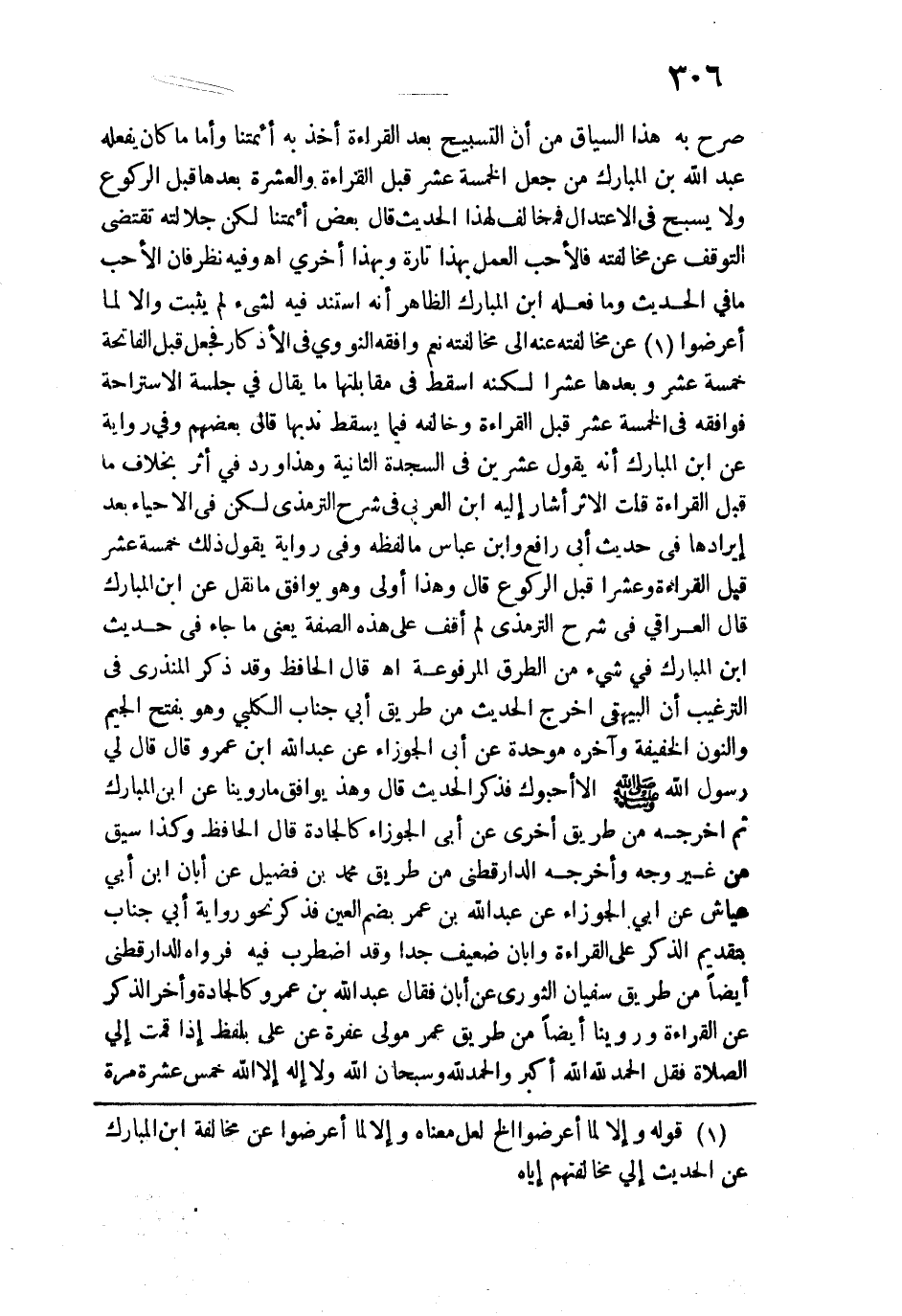 صرح به هذا السياق من أن التسبيح بعد القراءة أخذ به أئمتنا وأما ما كان يفعله عبد الله بن المبارك من جعل الخمسة عشر قبل القراءة والعشرة بعدها قبل الركوع ولا يسبح في الاعتدال فمخالف هذا الحديث قال بعض أئمتنا لكن جلالته تقتضي التوقف عن مخالفته فالأحب العمل بهذا تارة وبهذا أخرى اهـ، وفيه نظر فإن الأحب ما في الحديث وما فعله ابن المبارك الظاهر أنه استند فيه لشيء لم يثبت وإلا لما أعرضوا عن مخالفته عنه إلى مخالفته نعم وافقه النووي في الأذكار فجعل قبل الفاتحة خمسة عشر وبعدها عشرًا لكنه أسقط في مقابلتها ما يقال في جلسة الاستراحة فوافقه في الخمسة عشر قبل القراءة وخالفته فيما يسقط ندبها قال بعضهم وفي رواية عن ابن المبارك أنه يقول عشرين في السجدة الثانية وهذا ورد في أثر بخلاف ما قبل القراءة قلت الأثر أشار إليه ابن العربي في شرح الترمذي لكن في الاحياء بعد إيرادها في حديث أبي رافع وابن عباس ما لفظه وفي رواية يقول ذلك خمسة عشر قيل القراءة وعشرا قبل الركوع قال وهذا أولى وهو يوافق ما نقل عن ابن المبارك قال العراقي في شرح الترمذي لم أقف على هذه الصفة يعني ما جاء في حديث ابن المبارك في شيء من الطرق المرفوعة اهـ. قال الحافظ وقد ذكر المنذري في الترغيب أن البيهقي أخرج الحديث من طريق أبي جناب الكلبي وهو بفتح الجيم والنون الخفيفة وآخره موحدة عن أبي الجوزاء عن عبد الله بن عمرو قال قال لي رسول الله - صلى الله عليه وسلم - ألا أحبوك فذكر الحديث قال وهذا يوافق ما روينا عن ابن المبارك ثم أخرجه من طريق أخرى عن أبي الجوزاء كالجادة قال الحافظ وكذا سيق من غير وجه وأخرجه الدارقطني من طريق محمد بن فضيل عن أبان بن أبي عياش عن أبي الجوزاء عن عبد الله بن عمر بضم العين فذكر نحو رواية أبي جناب بتقديم الذكر على القراءة وأبان ضعيف جدًّا وقد اضطرب فيه فرواه الدارقطني أيضًا من طريق سفيان الثوري عن أبان فقال عبد الله بن عمرو كالجادة وآخر الذكر عن القراءة وروينا أيضًا من طريق عمر مولي عفرة عن علي بلفظ إذا قصت إلى الصلاة فقل الحمد الله الله أكبر والحمد الله وسبحان الله ولا إله إلَّا الله خمس عشرة مرة