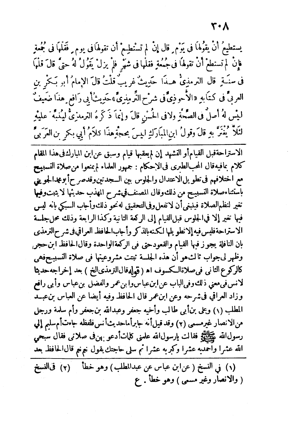 الاستراحة قبل القيام أو التشهد إن لم يعقبها قيام وسبق عن ابن المبارك في هذا المقام كلام بما فيه قال المحب الطبري في الأحكام: جمهور العلماء لم يمنعوا من صلاة التسبيح مع اختلافهم في تطويل الاعتدال والجلوس بين السجدتين وقد صرح أبو محمد الجويني باستثناء صلاة التسبيح من ذلك وقال المصنف في شرح المهذب حديثها لا يثبت وفيها تغير لنظم الصلاة فينبغي أن لا تفعل وفي التحقيق له نحو ذلك وأجاب السبكي بأنه ليس فيها تغير إلّا في الجلوس قبل القيام إلى الركعة الثانية وكذا الرابعة وذلك محل جلسة الاستراحة فليس فيه إلَّا تطويلها لكنه بالذكر وأجاب الحافظ العراقي في شرح الترمذي بأن النافلة يجوز فيها القيام والقعود حتى في الركعة الواحدة وقال الحافظ ابن حجر وظهر لي جواب ثالث هو أن هذه الجلسة ثبتت مشروعيتها في صلاة التسبيح فهي كالركوع الثاني في صلاة الكسوف اهـ. قوله: (قَال الترمذيُّ الخ) بعد إخراجه حديث لأنس في معنى ذلك وفي الباب عن ابن عباس وابن عمر والفضل بن عباس وأبي رافع وزاد العراقي في شرحه وعن ابن عمر قال الحافظ وفيه أيضًا عن العباس بن عبد المطلب وعلي بن أبي طالب وأخيه جعفر وعبد الله بن جعفر وأم سلمة ورجل من الأنصار غير مسمى وقد قيل إنه جابر أما حديث أنس فلفظه جاءت أم سليم إلى رسول الله - صلى الله عليه وسلم - قالت يا رسول الله علمني كلمات أدعو بهن في صلاتي فقال سبحي الله عشرًا واحمديه عشرًا وكبريه عشرًا ثم سلي حاجتك يقول نعم نعم قال الحافظ بعد