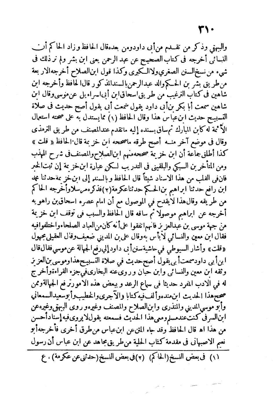والبيهقي وذكر من تقدم من أبي داود ومن بعده قال الحافظ وزاد الحاكم أن النسائي أخرجه في كتاب الصحيح عن عبد الرحمن يعني ابن بشر ولم نر ذلك في شيء من نسخ السنن الصغرى ولا الكبرى وكذا قول ابن الصلاح أخرجه الأربعة من طريق بشر بن الحكم والد عبد الرحمن بالسند المذكور قال الحافظ وأخرجه ابن شاهين في كتاب الترغيب من طريق إسحاق بن أبي إسرائيل عن موسى وقال ابن شاهين سمعت أبا بكر بن أبي داود يقول سمعت أبي يقول أصح حديث في صلاة التسبيح حديث ابن عباس هذا وقال الحافظ مما يستدل به على صحته استعمال الأئمة له كابن المبارك ثم ساق بسنده إليه ما تقدم عند المصنف من طريق الترمذي وقال في موضع آخر منه أصح طرقه ما صححه ابن خزيمة قال الحافظ "قلت" كذا أطلق جماعة أن ابن خزيمة صححه منهم ابن الصلاح والمصنف في شرح المهذب ومن المتأخرين السبكي والبلقيني في التدريب لكن عبارة ابن خزيمة إن ثبت الخبر فإن في القلب من هذا الإسناد شيئًا قال الحافظ وبالسند إلى ابن خزيمة حدثنا محمد بن رافع حدثنا إبراهيم بن الحكم حدثنا عكرمة فذكره مرسلأوأخرجه الحاكم من طريقه وقال هذا لا يقدح في الموصول مع أن إمام عصره إسحاق بن راهويه أخرجه عن إبراهيم موصولًا ثم ساقه قال الحافظ والسبب في توقف ابن خزيمة من جهة موسى بن عبد العزيز فإنهم اتفقوا على أنه كان من العباد الصلحاء واختلفوا فيه فقال ابن معين والنسائي لا بأس به وقال علي بن المديني ضعيف وقال العقيلي مجهول "قلت" وأشار السيوطي في حاشية سنن أبي داود إلى رفع الجهالة عن موسى فقال قال ابن أبي داود سمعت أبي يقول أصح حديث في صلاة التسبيح هذا وموسى بن العزيز وثقه ابن معين والنسائي وابن حبان وروى