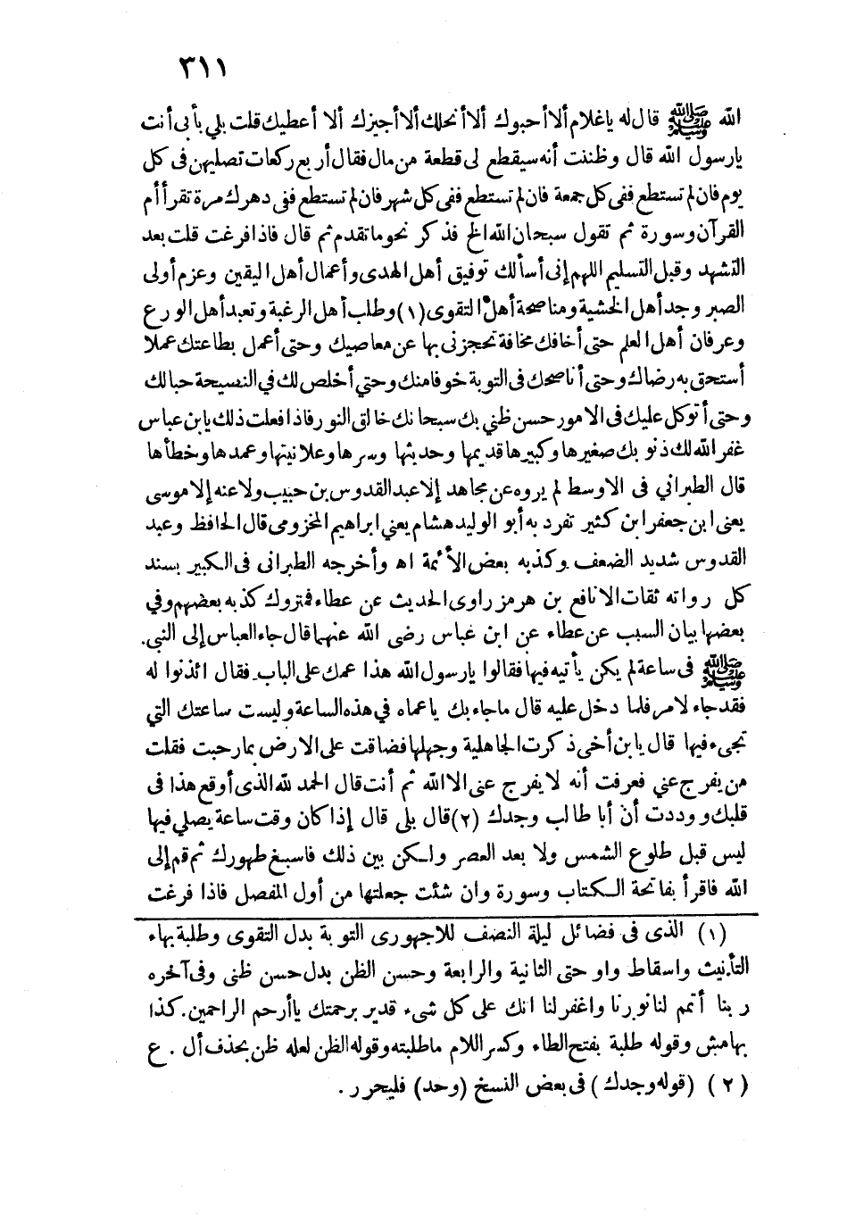 الله - صلى الله عليه وسلم - قال له يا غلام ألا أحبوك ألا أنحلك ألا أجيزك ألا أعطيك قلت بلى بأبي أنت يا رسول الله قال وظننت أنه سيقطع لي قطعة من مال فقال أربع ركعات تصليهن في كل يوم فإن لم تستطع ففي كل جمعة فإن لم تستطع ففي كل شهر فإن لم تستطع ففي دهرك مرة تقرأ أم القرآن وسورة ثم تقول سبحان الله الخ. فذكر نحو ما تقدم ثم قال فإذا فرغت قلت بعد التشهد وقيل التسليم اللهم إني أسألك توفيق أهل الهدى وأعمال أهل اليقين وعزم أولى الصبر وجد أهل الخشية ومناصحة أهل التقوى وطلب أهل الرغبة وتعبد أهل الورع وعرفان أهل العلم حتى أخافك مخافة تحجزني بها عن معاصيك وحتى أعمل بطاعتك عملًا أستحق به رضاك وحتى أناصحك في التوبة خوفًا منك وحتى أخلص لك في النصيحة حبا لك وحتى أتوكل عليك في الأمور حسن ظني بك سبحانك خالق النور فإذا فعلت ذلك يا بن عباس غفر الله لك ذنوبك صغيرها وكبيرها قديمها وحديثها وسرها وعلانيتها وعمدها وخطأها قال الطبراني في الأوسط لم يروه عن مجاهد إلّا عبد القدوس بن حبيب ولا عنه إلَّا موسى يعني ابن جعفر بن كثير تفرد به أبو الوليد هشام يعني إبراهيم المخزومي قال الحافظ وعبد القدوس شديد الضعف وكذبه بعض الأئمة اهـ، وأخرجه الطبراني في الكبير بسند كل رواته ثقات إلَّا نافع بن هرمز راوي الحديث عن عطاء فمتروك كذبه بعضهم وفي بعضها بيان السبب عن عطاء عن ابن عباس رضي الله عنهما قال جاء العباس إلى النبي - صلى الله عليه وسلم - لم يكن يأتيه فيها فقالوا يا رسول الله هذا عمك على الباب فقال ائذنوا فقد جاء لأمر فلما دخل عليه قال ما جاء بك يا عماه في هذه الساعة وليست ساعتك التي تجيء فيها قال يا بن أخي ذكرت الجاهلية وجهلها فضاقت علي الأرض بما رحبت فقلت من يفرج عني فعرفت أنه لا يفرج عني إلَّا الله ثم أنت قال الحمد الله الذي أوقع هذا في قلبك ووددت أن أبا طالب وجدك قال بلى قال إذا كان وقت ساعة يصلي فيها ليس قبل طلوع الشمس ولا بعد العصر ولكن بين ذلك فأسبغ طهورك ثم قم إلى الله فاقرأ بفاتحة الكتاب وسورة وإن شئت جعلتها من أول المفصل فإذا فرغت