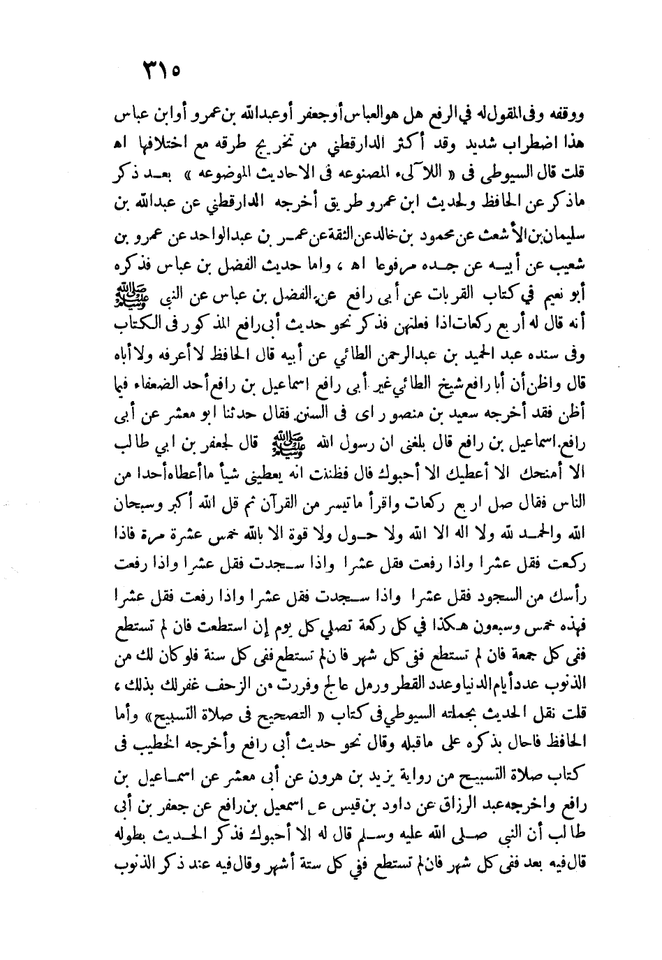 حديث الفضل بن عباس فذكره أبو نعيم في كتاب القربات عن أبي رافع عن الفضل بن عباس عن النبي - صلى الله عليه وسلم - أنه قال له أربع ركعات إذا فعلتهن فذكر نحو حديث أبي رافع المذكور في الكتاب وفي سنده عبد الحميد بن عبد الرحمن الطائي عن أبيه قال الحافقالا أعرفه وأباه قال وأظن أن أبا رافع شيخ الطائي غير أبي رافع إسماعيل بن رافع أحمد الضعفاء فيما أظن فقد أخرجه سعيد بن منصور أي في السنن فقال حدثنا أبو معشر عن أبي رافع إسماعيل بن رافع قال بلغني إن رسول الله - صلى الله عليه وسلم - قال لجعفر بن أبي طالب ألا أمنحك ألا أعطيك ألا أحبوك قال فظننت إنه يعطيني شيئًا ما أعطاه أحدًا من النّاس فقال صل أربع ركعات واقرأ ما تيسر من القرآن ثم قل الله أكبر وسبحان الله والحمد الله ولا إله إلَّا الله ولا حول ولا قوة إلَّا بالله خمس عشرة مرة فإذا ركعت فقل عشرًا وإذا رفعت فقل عشرًا وإذا سجدت فقل عشرًا وإذا رفعت رأسك من السجود فقل عشرًا وإذا سجدت فقل عشرًا وإذا رفعت فقل عشرًا فهذه خمس وسبعون هكذا في كل ركعة تصلي كل يوم إن استطعت فإن لم تستطع ففي كل جمعة فإن لم تستطع ففي كل شهر فإن لم تستطع ففي كل سنة فلو كان لك من الذنوب عدد أيام الدنيا وعدد القطر ورمل عالج وفررت من الزحف غفر لك بذلك، قلت نقل الحديث بجملته السيوطي في كتاب "التصحيح في صلاة التسبيح" وأما الحافظ فأحال بذكره على ما قبله وقال نحو حديث أبي رافع وأخرجه الخطيب في كتاب صلاة التسبيح من رواية يزيد بن هارون عن أبي معشر عن إسماعيل بن رافع وأخرجه عبد الرزاق عن داود بن قيس عن إسماعيل بن رافع عن جعفر بن أبي طالب أن النبي - صلى الله عليه وسلم - قال له ألا أحبوك فذكر الحديث بطوله قال فيه بعد ففي كل شهر فإن لم تستطع ففي كل ستة أشهر وقال فيه عند ذكر الذنوب
