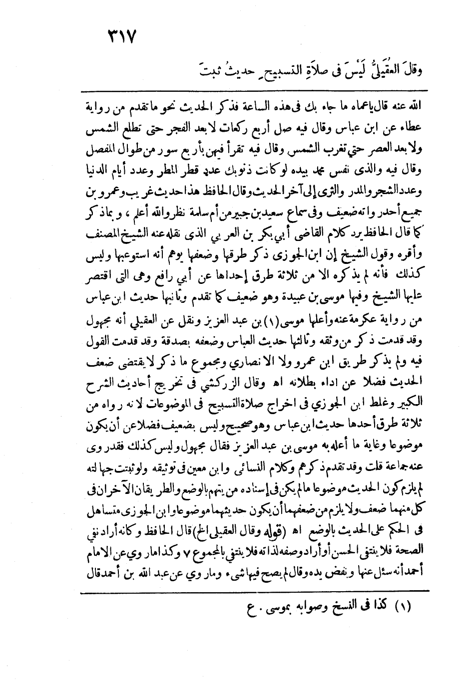 الله عنه قال يا عماه ما جاء بك في هذه الساعة فذكر الحديث نحو ما تقدم من رواية عطاء عن ابن عباس وقال فيه صل أربع ركعات لا بعد الفجر حتى تطلع الشمس ولا بعد العصر حتى تغرب الشمس وقال فيه تقرأ فيهن بأربع سور من طوال المفصل وقال فيه والذي نفس محمد بيده لو كانت ذنوبك عدد قطر المطر وعدد أيام الدنيا وعدد الشجر والمدر والثرى إلى آخر الحديث وقال الحافظ هذا حديث غريب وعمرو بن جميع أحد رواته ضعيف وفي سماع سعيد بن جبير من أم سلمة نظر والله أعلم، وبما ذكر كما قال الحافظ يرد كلام القاضي أبي بكر بن العربي الذي نقله عنه الشيخ المصنف وأقره وقول الشيخ إن ابن الجوزي ذكر طرقها وضعفها يوهم أنه استوعبها وليس كذلك فإنه لم يذكره إلَّا من ثلاثة طرق إحداها عن أبي رافع وهي التي اقتصر عليها الشيخ وفيها موسى بن عبيدة وهو ضعيف كما تقدم وثانيها حديث ابن عباس من رواية عكرمة عنه وأعلها موسى بن عبد العزيز ونقل عن العقيلي أنه مجهول وقد قدمت ذكر من وثقه وثالثها حديث العباس وضعفه بصدقة وقد قدمت القول فيه ولم يذكر طريق ابن عمرو ولا الأنصاري ومجموع ما ذكر لا يقتضي ضعف الحديث فضلًا عن أداء لملانه اهـ، وقال الزركشي في تخريج أحاديث الشرح الكبير وغلط ابن الجوزي في إخراج صلاة التسبيح في الموضوعات لأنه رواه من ثلاثة طرق أحدها حديث ابن عباس وهو صحيح وليس بضعيف فضلًا عن أن يكون موضوعًا وغاية ما أعله به موسى بن عبد العزيز فقال مجهول وليس كذلك فقد روى عنه جماعة قلت وقد تقدم ذكرهم وكلام النسائي وابن معين في توثيقه ولو ثبتت جهالته لم يلزم كون الحديث موضوعًا ما لم يكن في إسناده من يتهم بالوضع والطريقان الآخران في كل منهما ضعف ولا يلزم من ضعفهما أن يكون حديثهما موضوعًا وابن الجوزي متساهل في الحكم على الحديث بالوضع اهـ. قوله: (وقَال العُقَيليُّ الخ) قال الحافظ وكأنه أراد نفي الصحة فلا ينتفي الحسن أو أراد وصفه لذاته فلا ينتفي بالمجموع وكذا ما روي عن الإِمام أحمد أنه سئل عنها ونفض يده وقال لم يصح فيها شيء وما روي عن عبد الله بن أحمد قال