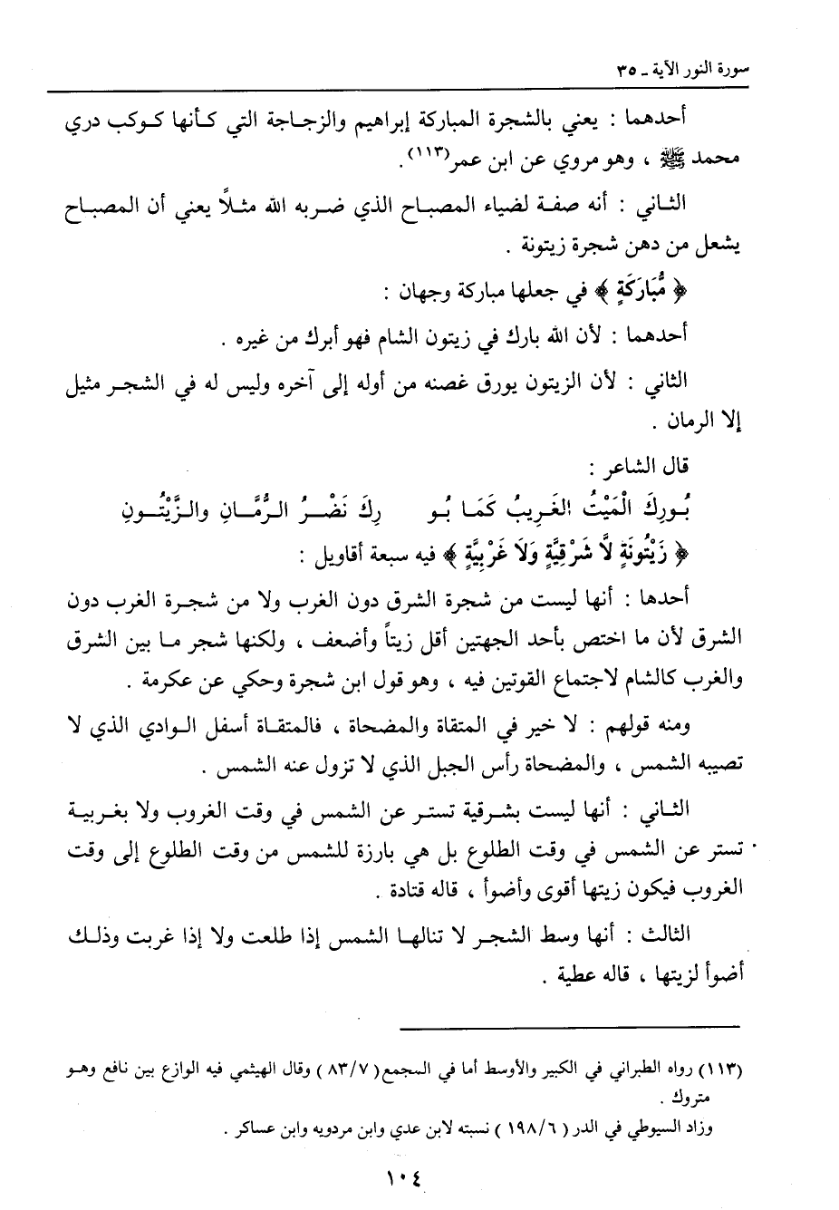 {زَيْتُونَةٍ لاَّ شَرْقِيَّةٍ وَلاَ غَرْبِيَّةٍ} فيه سبعة أقاويل: أحدها: أنها ليست من شجرة الشرق دون الغرب ولا من شجرة الغرب دون الشرق لأن ما اختص بأحد الجهتين أقل زيتاً وأضعف , ولكنها شجر ما بين الشرق والغرب كالشام لاجتماع القوتين فيه، وهو قول ابن شجرة وحكي عن عكرمة. ومنه قولهم: لا خير في المتقاة والمضحاة , فالمتقاة أسفل الوادي الذي لا تصيبه الشمس , والمضحاة رأس الجبل الذي لا تزول عنه الشمس. الثاني: أنها ليست بشرقية تستر عن الشمس في وقت الغروب ولا بغربية تستر عن الشمس وقت الطلوع بل هي بارزة للشمس من وقت الطلوع إلى وقت الغروب فيكون زيتها أقوى وأضوأ، قاله قتادة. الثالث: أنها وسط الشجرة لا تنالها الشمس إذا طلعت ولا إذا غربت وذلك أضوأ لزيتها، قاله عطية.