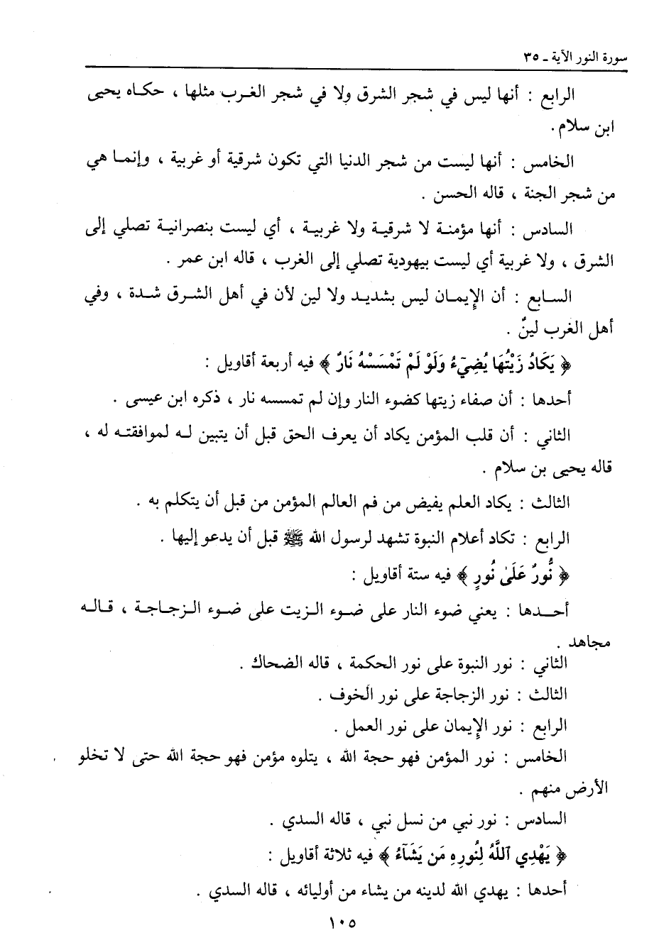 الرابع: أنها ليس في شجر الشرق ولا في شجر الغرب مثلها , حكاه يحيى ابن سلام. الخامس: أنها ليست من شجر الدنيا التي تكون شرقية أو غربية , وإنما هي من شجر الجنة , قاله الحسن. السادس: أنها مؤمنة لا شرقية ولا غربية , أي ليست بنصرانية تصلي إلى الشرق , ولا غربية أي ليست بيهودية تصلي إلى الغرب , قاله ابن عمر. السابع: أن الإِيمان ليس بشديد ولا لين لأن في أهل الشرق شدة , وفي أهل الغرب لينٌ. {يَكَادُ زَيْتُهَا يُضِيءُ وَلَوْ لَمْ تَمْسَسْهُ نَارٌ} فيه أربعة أقاويل: أحدها: أن صفاء زيتها كضوء النار وإن لم تمسسه نار , ذكره ابن عيسى. الثاني: أن قلب المؤمن يكاد أن يعرف قبل أن يتبين له لموافقته له , قاله يحيى بن سلام. الثالث: يكاد العلم يفيض من فم العالم المؤمن من قبل أن يتكلم به. الرابع: تكاد أعلام النبوة تشهد لرسول الله صلى الله عليه وسلم قبل أن يدعو إليها. {نُّورٌ عَلَى نُورٍ} فيه ستة أقاويل: أحدها: يعني ضوء النار على ضوء الزيت على ضوء الزجاجة، قاله مجاهد. الثاني: نور النبوة على نور الحكمة , قاله الضحاك. الثالث: نور الزجاجة على نور الخوف. الرابع: نور الإِيمان على نور العمل. الخامس: نور المؤمن فهو حجة الله، يتلوه مؤمن فهو حجة الله حتى لا تخلو الأرض منهم. السادس: نور نبي من نسل نبي، قاله السدي. {يَهْدِي لِنُورِهِ مَن يَشَآءُ} فيه ثلاثة أقاويل: أحدها: يهدي الله لدينه من يشاء من أوليائه، قاله السدي.