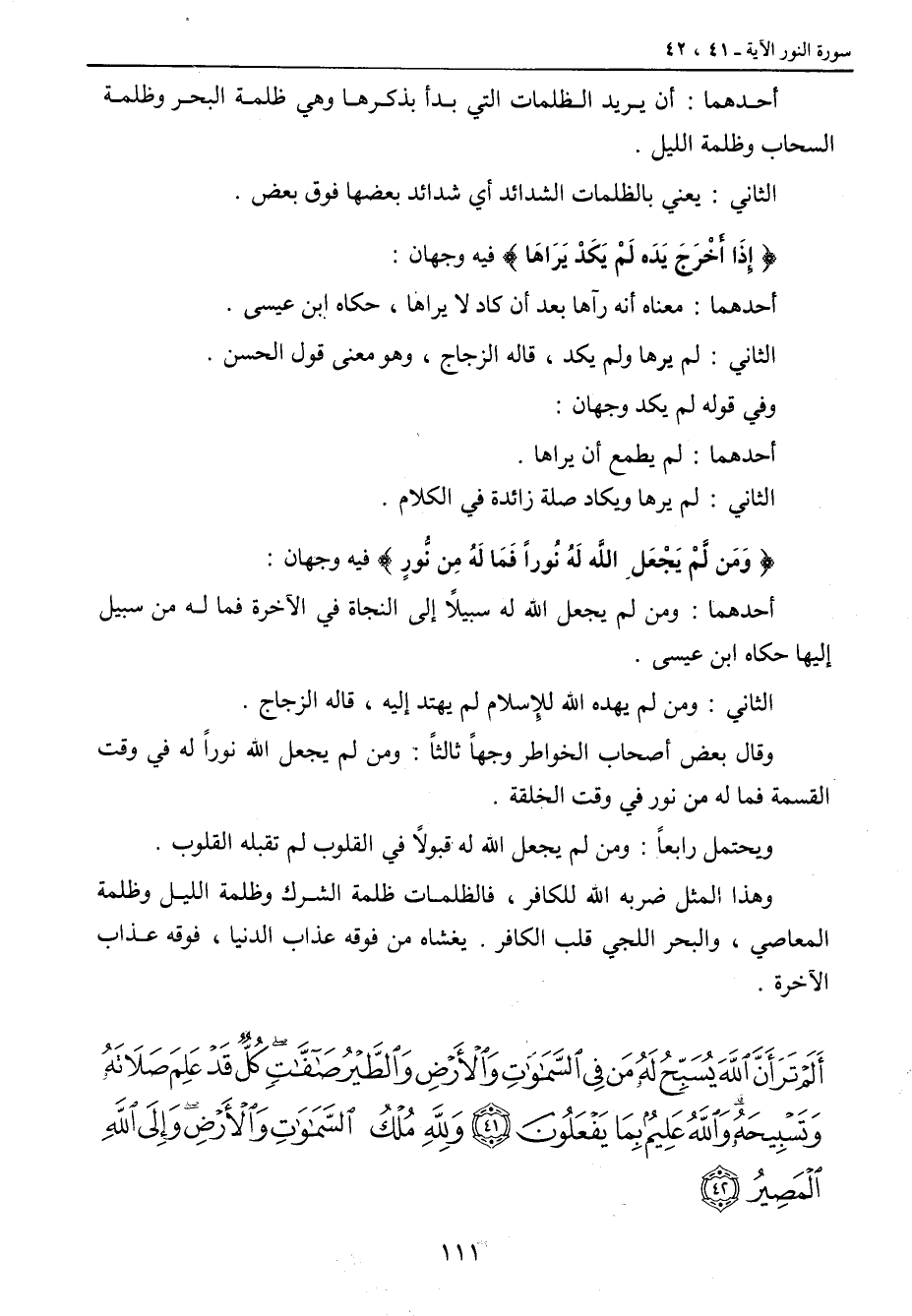 أحدهما: أن يريد الظلمات التي بدأ بذكرها وهي ظلمة البحر وظلمة السحاب وظلمة الليل. الثاني: يعني بالظلمات الشدائد أي شدائد بعضها فوق بعض. {إِذَا أخْرَجَ يَدَه لَمْ يَكَدْ يَرَاهَا} فيه وجهان: أحدهما: معناه أنه رآها بعد أن كاد لا يراها , حكاه ابن عيسى. الثاني: لم يرها ولم يكد , قاله الزجاج , وهو معنى قول الحسن. وفي قوله لم يكد وجهان: أحدهما: لم يطمع أن يراها. الثاني: لم يرها ويكاد صلة زائدة في الكلام. {ومَن لَّمْ يَجْعَلِ اللَّهَ لَهُ نُوراً فَمَا لَهُ مِن نُّورٍ} فيه وجهان: أحدهما: ومن لم يجعل الله له سبيلاً إلى النجاة في الآخرة فما له من سبيل إليها حكاه ابن عيسى. الثاني: ومن لم يهده الله للإِسلام لم يهتد إليه , قاله الزجاج. وقال بعض أصحاب الخواطر وجهاً ثالثاً: ومن لم يجعل الله نوراً له في وقت القسمة فما له من نور في وقت الخلقة. ويحتمل رابعاً: ومن لم يجعل الله له قبولاً في القلوب لم تقبله القلوب. وهذا المثل ضربه الله للكافر , فالظمات ظلمة الشرك وظلمة الليل وظلمة المعاصي , والبحر اللجي قلب الكافر , يغشاه من فوقه عذاب الدنيا , فوقه عذاب الآخرة.