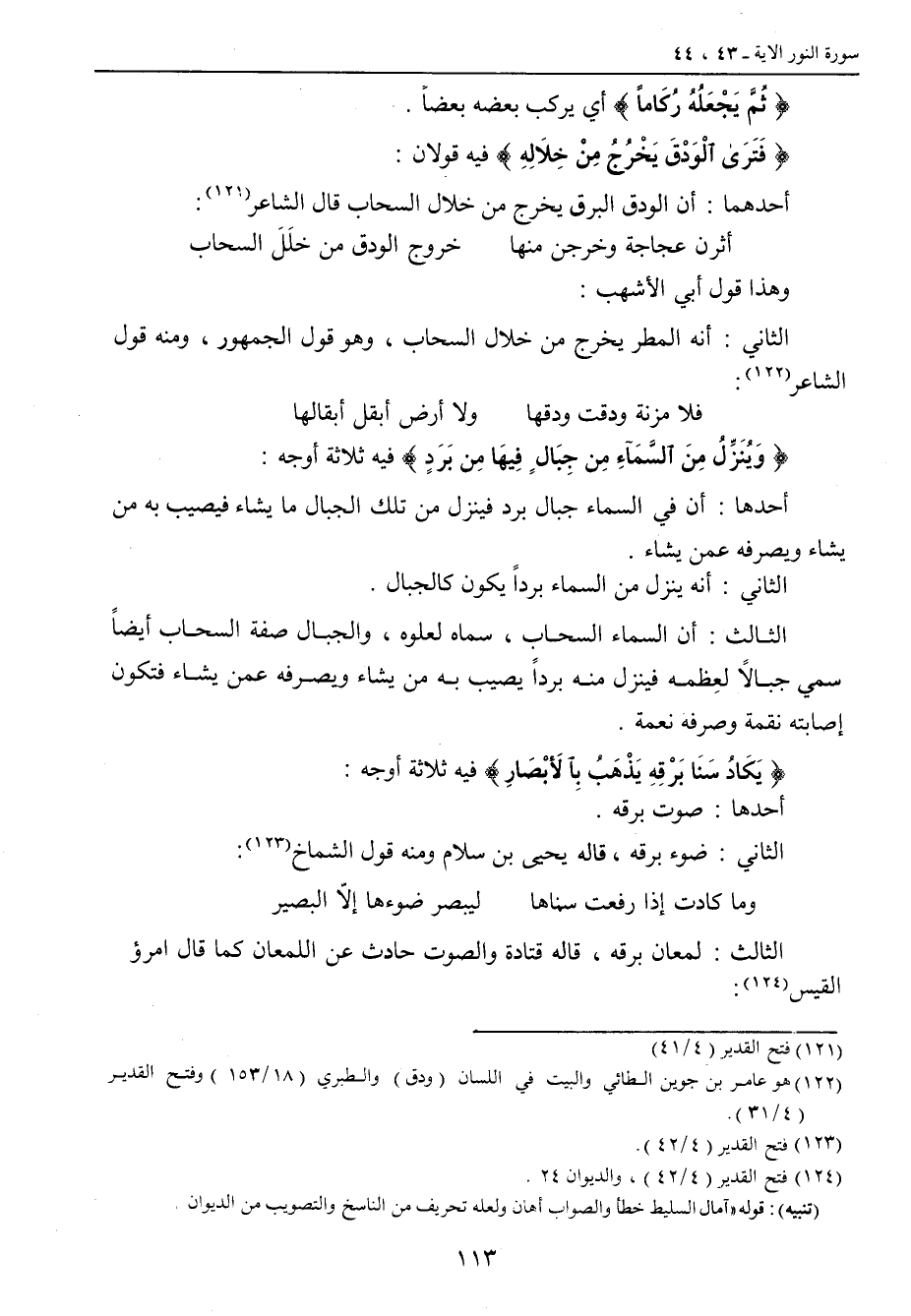 {وَيُنَزِّلُ مِنَ السَّمَآءِ مِن جِبَالٍ فِيهَا مِن بَرَدٍ} فيه ثلاثة أوجه: أحدها: أن في السماء جبال برد فينزل من تلك الجبال ما يشاء فيصيب به من يشاء ويصرفه عمن يشاء. الثاني: أنه ينزل من السماء برداً يكون كالجبال. الثالث: أن السماء السحاب , سماه لعلوه , والجبال صفة السحاب أيضاً سمي جبالاً لعِظمه فينزل منه برداً يصيب به من يشاء ويصرفه عمن يشاء فتكون إصابته نقمة وصرفه نعمة. {يَكَادُ سَنَا بَرْقِهِ يَذْهَبُ بِالأَبْصَارِ} فيه ثلاثة أوجه: أحدها: صوت برقه. الثاني: ضوء برقه , قاله يحيى بن سلام ومنه قول الشماخ.
