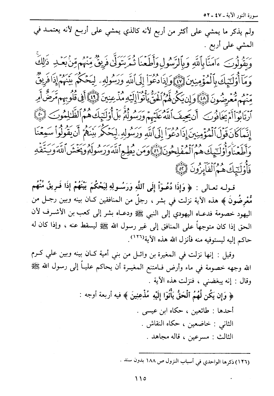{ويقولون آمنا بالله وبالرسول وأطعنا ثم يتولى فريق منهم من بعد ذلك وما أولئك بالمؤمنين وإذا دعوا إلى الله ورسوله ليحكم بينهم إذا فريق منهم معرضون وإن يكن لهم الحق يأتوا إليه مذعنين أفي قلوبهم مرض أم ارتابوا أم يخافون أن يحيف الله عليهم ورسوله بل أولئك هم الظالمون إنما كان قول المؤمنين إذا دعوا إلى الله ورسوله ليحكم بينهم أن يقولوا سمعنا وأطعنا وأولئك هم المفلحون ومن يطع الله ورسوله ويخش الله ويتقه فأولئك هم الفائزون} قوله تعالى: {وَإِذَا دُعُواْ إِلَى اللَّهِ وَرَسُولِهِ لِيَحْكُمَ بَيْنَهُمْ إِذَا فَرِيقٌ مِّنْهُم مُّعْرِضُونَ} هذه الآية نزلت في بشر , رجلٌ من المنافقين كان بينه وبين رجل من اليهود خصومة فدعاه اليهودي إلى النبي صلى الله عليه وسلم ودعاه بشر إلى كعب بن الأشرف لأن الحق إذا كان متوجهاً على المنافق إلى غير رسول الله صلى الله عليه وسلم ليسقط عنه , وإذا كان له حاكم إليه ليستوفيه منه فأنزل الله هذه الآية. وقيل: إنها نزلت في المغيرة بن وائل من بني أمية كان بينه وبين علي كرم الله وجهه خصومة في ماء وأرض فامتنع المغيرة أن يحاكم علياً إلى رسول الله صلى الله عليه وسلم وقال: إنه يبغضني , فنزلت هذه الآية. {وَإِن يَكُن لَّهُمُ الْحَقُّ يَأْتُوا إِلَيْهِ مُذْعِنِينَ} فيه أربعة أوجه: أحدهما: طائعين , حكاه ابن عيسى. الثاني: خاضعين , حكاه النقاش. الثالث: مسرعين , قاله مجاهد.