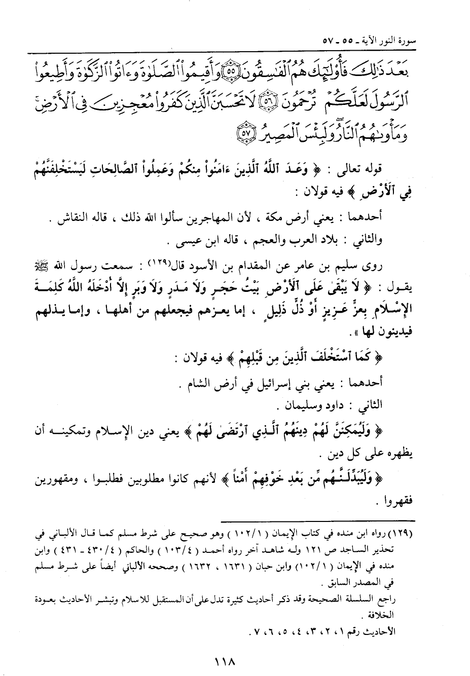 بعد ذلك فأولئك هم الفاسقون وأقيموا الصلاة وآتوا الزكاة وأطيعوا الرسول لعلكم ترحمون لا تحسبن الذين كفروا معجزين في الأرض ومأواهم النار ولبئس المصير} قوله تعالى: {وَعَدَ اللَّهُ الَّذِينَءَامَنُواْ مِنكُمْ وَعِمِلُواْ الصَّالِحَاتِ ليَسَتَخْلِفَنَّهُمْ فِي الأَرْضِ} فيه قولان: أحدهما: يعني أرض مكة , لأن المهاجرين سألوا الله ذلك , قاله النقاش. والثاني: بلاد العرب والعجم , قاله ابن عيسى. روى سليم بن عامر عن المقدام بن الأسود قال: سمعت رسول الله صلى الله عليه وسلم يقول: (لاَ يَبْقَى عَلَى الأَرْضِ بَيْتُ حَجَرٍ وَلاَ مَدَرٍ وَلاَ وَبَرٍ إِلاَّ أَدْخَلَهُ اللَّهُ كَلِمَةَ الإِسْلاَمِ بِعزٍّ عَزِيزٍ أَوْ ذُلٍّ ذَلِيلٍ , إما يعزهم فيجعلهم من أهلها , وإما يذلهم فيدينون لها). {كَمَا اسْتَخْلَفَ الَّذِينَ مِن قَبْلِهِمْ} فيه قولان: أحدهما يعني بني إسرائيل في أرض الشام. الثاني: داود وسليمان. {وَلَيُمَكِنَنَّ لَهُمْ دِينَهُمُ الَّذِي ارْتَضَى لَهُمْ} يعني دين الإِسلام وتمكينه أن يظهره على كل دين. {وَلَيُبَدِّلَنَّهُم مِّن بَعْدِ خَوْفِهِم أَمْناً} لأنهم كانوا مطلوبين فطلبوا , ومقهورين فقهروا.