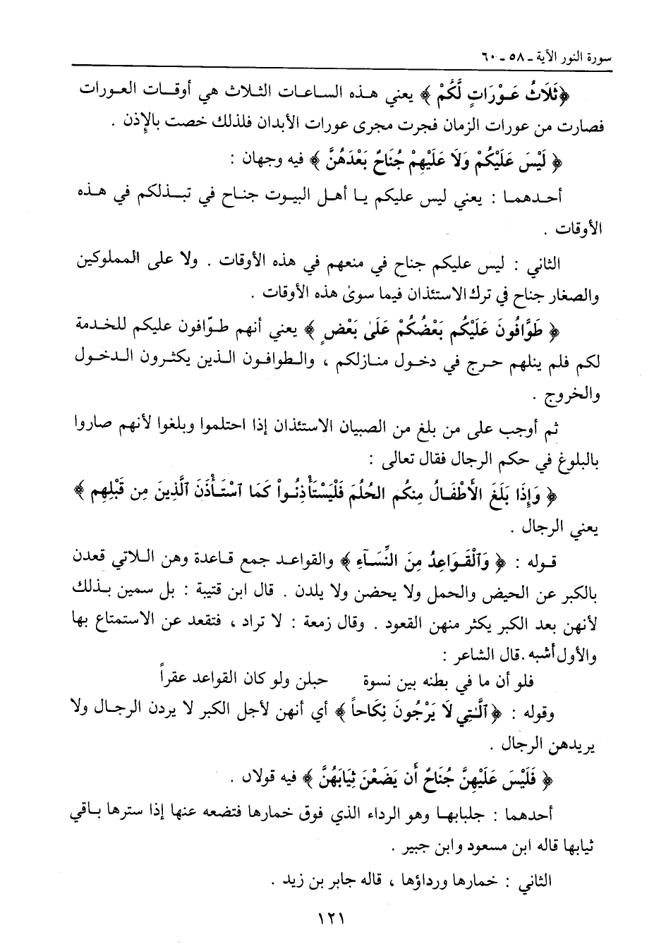 {ثَلاَثُ عَوْرَاتٍ لَّكُمْ} يعني هذه الساعات الثلاث هي أوقات العورات فصارت من عورات الزمان فجرت مجرى عورات الأبدان فلذلك خصت بالإِذن. {لَيْسَ عَلَيْكَمْ وَلاَ عَلَيْهِمْ جَنَاحٌ بَعْدَهُنَّ} فيه وجهان: أحدهما: يعني ليس عليكم يا أهل البيوت جناح في تبذلكم في هذه الأوقات. الثاني: ليس عليكم جناح في منعهم في هذه الأوقات. ولا على المملوكين والصغار جناح في ترك الاستئذان فيما سوى هذه الأوقات. {طَوَّافُونَ عَلَيْكَم بَعْضُكُمْ عَلَى بَعْضٍ} يعني أنهم طوّافون عليكم للخدمة لكم فلم ينلهم حرج في دخول منازلكم , والطوافون الذين يكثرون الدخول والخروج. ثم أوجب على من بلغ من الصبيان الاستئذان إذا احتلموا وبلغوا لأنهم صاروا بالبلوغ في حكم الرجال فقال تعالى: {وَإِذَا بَلَغَ الأَطْفَالُ مِنكُم الحُلُمَ فَلْيَسْتَأَذِنُواْ كَمَا اسْتَأَْذَنَ الَّذِينَ مِن قَبْلِهِم} يعني الرجال. قوله: {وَالْقَوَاعِدُ مِنَ النِّسَآءِ} والقواعد جمع قاعدة وهن اللاتي قعدن بالكبر عن الحيض والحمل ولا يحضن ولا يلدن. قال ابن قتيبة: بل سمين بذلك لأنهن بعد الكبر يكثر منهن القعود. وقال زمعة: لا تراد , فتقعد عن الاستمتاع بها والأول أشبه. قال الشاعر: