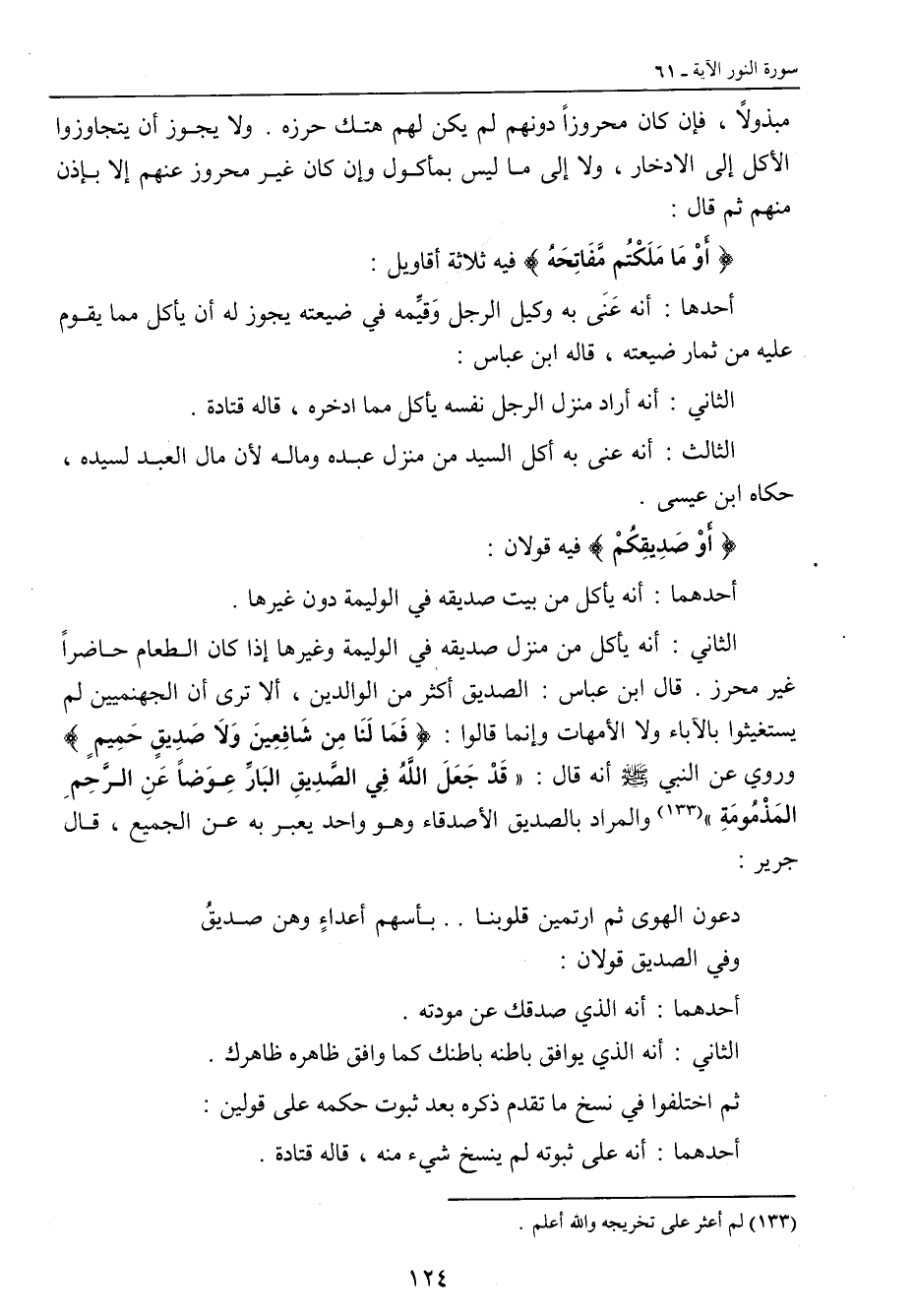 مبذولاً، فإن كان محروزاً دونهم لم يكن لهم هتك حرزه. ولا يجوز أن يتجاوزوا الأكل إلى الادخار، ولا إلى ما ليس بمأكول وإن كان غير محروز عنهم إلا بإذن منهم ثم قال: {أَوْ مَا مَلَكْتُم مَّفَاتِحَهُ} فيه ثلاثة أقاويل: أحدها: أنه عَنَى به وكيل الرجل وَقيِّمه في ضيعته يجوز له أن يأكل مما يقوم عليه من ثمار ضيعته , قاله ابن عباس. الثاني: أنه أراد منزل الرجل نفسه يأكل مما ادخره , قاله قتادة. الثالث: أنه عنى به أكل السيد من منزل عبده وماله لأن مال العبد لسيده , حكاه ابن عيسى. {أَوْ صَدِيقِكُمْ} فيه قولان: أحدهما: أنه يأكل من بيت صديقه في الوليمة دون غيرها. الثاني: أنه يأكل من منزل صديقه في الوليمة وغيرها إذا كان الطعام حاضراً غير محرز. قال ابن عباس: الصديق أكثر من الوالدين , ألا ترى أن الجهنميين لم يستغيثوا بالآباء ولا الأمهات وإنما قالوا: {فَمَا لَنَا مِن شَافِعِينَ وَلاَ صَدِيقٍ حَمِيمٍ} وروي عن النبي صلى الله عليه وسلم أنه قال: (قَدْ جَعَلَ اللَّهُ فِي الصَّدِيقِ البَارِّ عِوَضَاً عَنِ الرَّحِمِ المَذْمُومَةِ) والمراد بالصديق الأصدقاء وهو واحد يعبر به عن الجميع , قال جرير:
