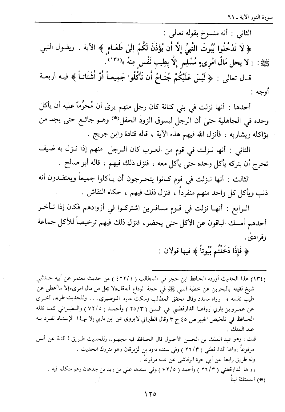 الثاني: أنه منسوخ بقوله تعالى: {لاَ تَدْخُلُوا بُيُوتَ النَّبيِّ إِلاَّ أَن يُؤْذَنَ لَكُمْ إِلَى طَعَامٍ} الآية. ويقول النبي صلى الله عليه وسلم: (لا يحل مَالُ امْرِىءْ مُسْلِمٍ إلاَّ بِطِيبِ نَفْسٍ مِنهُ) قال تعالى: {لَيْسَ عَلَيْكُمْ جُنَاحٌ أَن تَأْكُلُوا جَمِيعاً أَوْ أَشْتَاتاً} فيه أربعة أوجه: أحدها: أنها نزلت في بني كنانة كان رجل منهم يرى أن مُحرَّماً عليه أن يأكل وحده في الجاهلية حتى أن الرجل ليسوق الزود الحفل وهو جائع حتى يجد من يؤاكله ويشاربه , فأنزل فيهم هذه الآية , قاله قتادة وابن جريج. الثاني: أنها نزلت في قوم من العرب كان الرجل منهم إذا نزل به ضيف تحرج أن يتركه يأكل وحده حتى يأكل معه , فنزل ذلك فيهم , قال أبو صالح. الثالث: أنها نزلت في قوم كانوا يتحرجون أن يأكلوا جميعاً ويعتقدون أنه ذنب ويأكل كل واحد منهم منفرداً , فنزل ذلك فيهم , حكاه النقاش. الرابع: أنها نزلت في قوم مسافرين اشتركوا في أزوادهم فكان إذا تأخر أحدهم أمسك الباقون عن الأكل حتى يحضر , فنزل ذلك فيهم ترخيصاً للأكل جماعة وفرادى. {فَإِذَا دَخَلْتُم بُيُوتاً} فيها قولان: