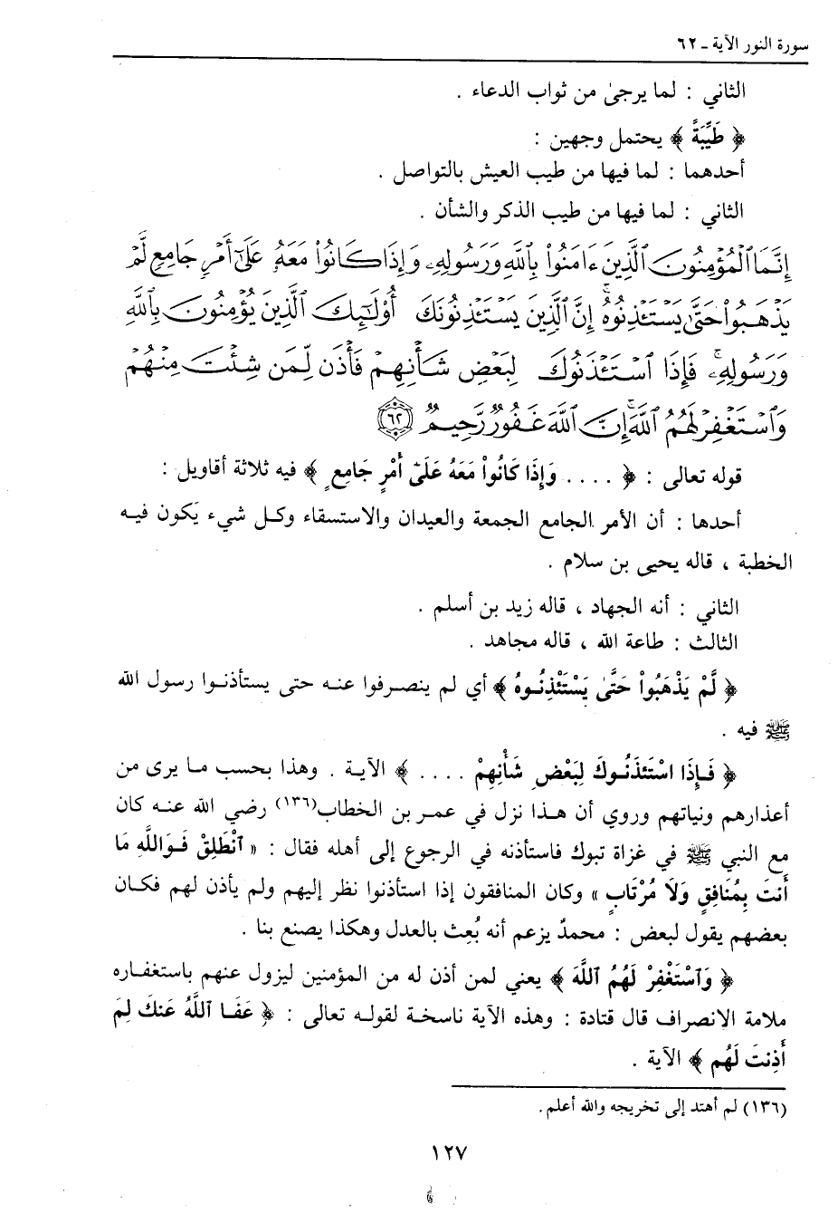 {إنما المؤمنون الذين آمنوا بالله ورسوله وإذا كانوا معه على أمر جامع لم يذهبوا حتى يستأذنوه إن الذين يستأذنونك أولئك الذين يؤمنون بالله ورسوله فإذا استأذنوك لبعض شأنهم فأذن لمن شئت منهم واستغفر لهم الله إن الله غفور رحيم} قوله تعالى: { ... . وَإِذَا كَانُواْ مَعَهُ عَلَى أَمْرٍ جَامِعٍ} فيه ثلاثة أقاويل: أحدها: أن الأمر الجامع الجمعة والعيدان والاستسقاء وكل شيء يَكون فيه الخطبة , قاله يحيى بن سلام. الثاني: أنه الجهاد , قاله زيد بن أسلم. الثالث: طاعة الله , قاله مجاهد. {لَّمْ يَذْهَبُواْ حَتَّى يَسْتَئْذِنُوهُ} أي لم ينصرفوا عنه حتى يستأذنوا رسول الله صلى الله عليه وسلم فيه. {فَإِذَا اسْتَئذَنُوكَ لبَعْضِ شَأْنِهِمْ ... .} الآية. وهذا بحسب ما يرى من أعذارهم ونياتهم وروي أن هذا نزل في عمر بن الخطاب رضي الله عنه كان مع النبي صلى الله عليهم وسلم في غزاة بتوك فاستأذنه في الرجوع إلى أهله فقال: (انْطَلِقْ فَوَاللَّهِ مَا أَنتَ بِمُنَافِقٍ وَلاَ مُرْتَابٍ) وكان المنافقون إذا استأذنوا نظر إليهم ولم يأذن لهم فكان بعضهم يقول لبعض: محمدٌ يزعم أنه بُعِث بالعدل وهكذا يصنع بنا. {وَاسْتَغْفِرْ لَهُمُ اللَّهَ} يعني لمن أذن له من المؤمنين ليزول عنه باستغفاره ملامة الانصراف قال قتادة: وهذه الآية ناسخة قوله تعالى: {عَفَا اللَّهُ عَنكَ لِمَ أَدِنتَ لَهُم} الآية.