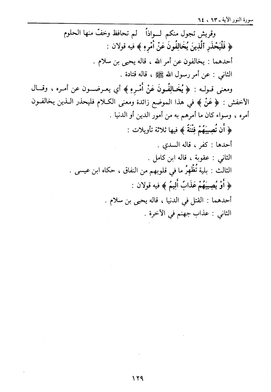 {فَلْيَحْذَرِ الَّذِينَ يُخَالِفُونَ عَنْ أَمْرِهِ} فيه قولان: أحدهما: يخالفون عن أمر الله , قاله يحيى بن سلام. الثاني: عن أمر رسول الله صلى الله عليه وسلم , قاله قتادة. ومعنى قوله: {يُخَالِفُونَ عَنْ أَمْرِهِ} أي يعرضون عن أمره , وقال الأخفش: {عَنْ} في هذا الموضع زائدة ومعنى الكلام فليحذر الذين يخالفون أمره , وسواء كان ما أمرهم به من أمور الدين أو الدنيا. {أَن تُصِيبَهُمْ فِتْنَةٌ} فيها ثلاثة تأويلات: أحدها: كفر، قاله السدي. الثاني: عقوبة , قاله ابن كامل. الثالث: بلية تُظْهِرُ ما في قلوبهم من النفاق , حكاه ابن عيسى. {أَوْ يُصِيبَهُمْ عَذَابٌ أَلِيمٌ} فيه قولان: أحدهما: القتل في الدنيا , قاله يحيى بن سلام. الثاني: عذاب بجهنم في الآخرة.