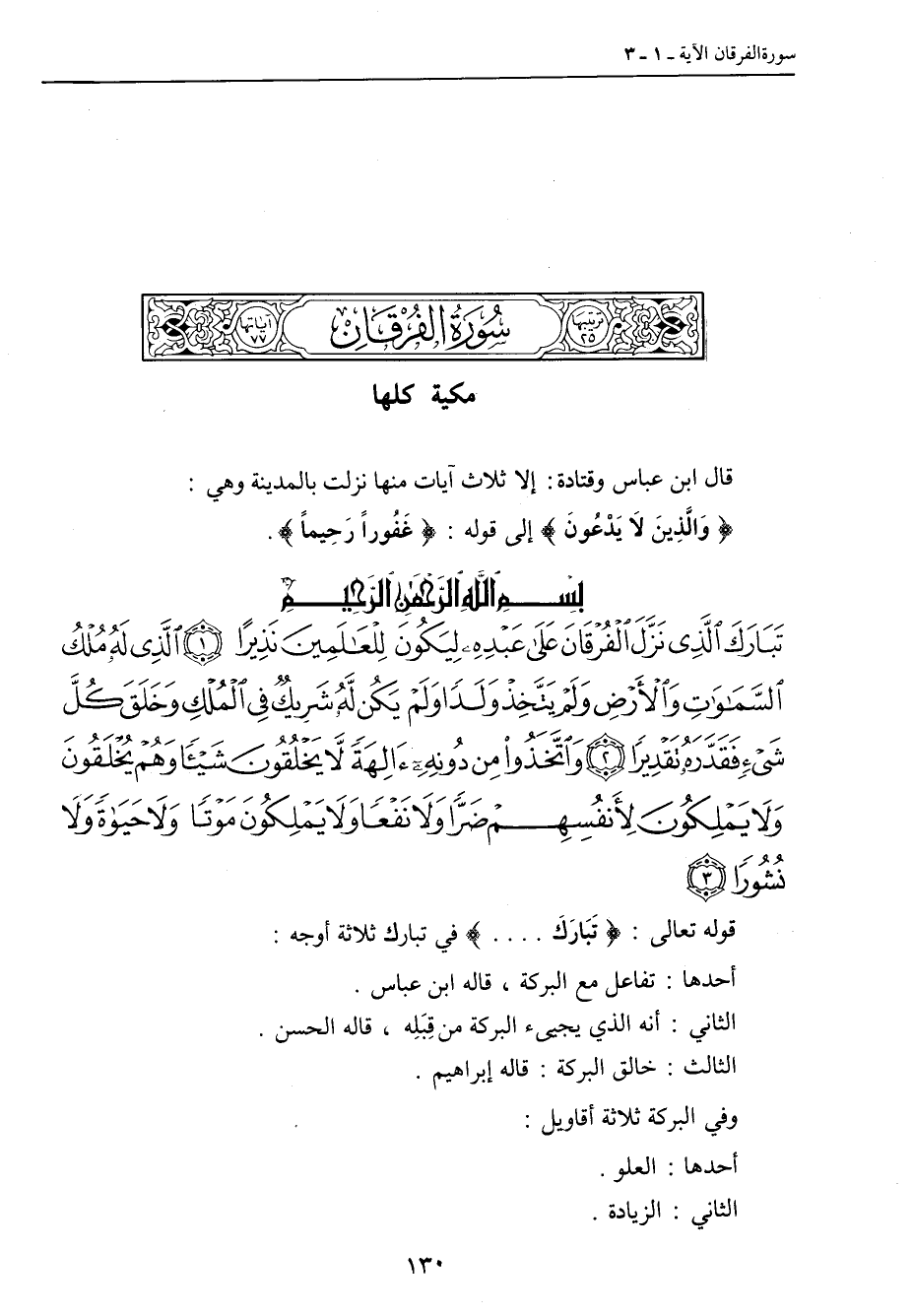 {تبارك الذي نزل الفرقان على عبده ليكون للعالمين نذيرا الذي له ملك السماوات والأرض ولم يتخذ ولدا ولم يكن له شريك في الملك وخلق كل شيء فقدره تقديرا واتخذوا من دونه آلهة لا يخلقون شيئا وهم يخلقون ولا يملكون لأنفسهم ضرا ولا نفعا ولا يملكون موتا ولا حياة ولا نشورا} قوله تعالى: {تَبَارَكَ ... .} في تبارك ثلاثة أوجه: أحدها: تفاعل مع البركة , قاله ابن عباس. الثاني: أنه الذي يجيىء البركة من قِبَلِهِ , قاله الحسن. الثالث: خالق البركة: قاله إبراهيم. وفي البركة ثلاثة أقاويل: أحدها: العلو. الثاني: الزيادة.