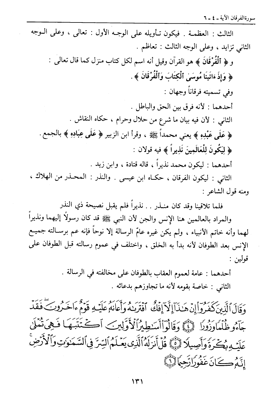 الثالث: العظمة. فيكون تأويله على الوجه الأول: تعالى , وعلى الوجه الثاني تزايد , وعلى الوجه الثالث: تعاظم. و {الْفُرْقَانَ} هو القرآن وقيل إنه اسم لكل كتاب منزل كما قال تعالى: {وَإِذءَاتَينَا مُوسَى الْكِتَابَ وَالْفَرْقَانَ} وفي تسميته فرقاناً وجهان: أحدهما: لأنه فرق بين الحق والباطل. الثاني: لأن فيه بيان ما شرع من حلال وحرام , حكاه النقاش. {عَلَى عَبْدِهِ} يعني محمداً صلى الله عليه وسلم , وقرأ ابن الزبير {عَلَى عِبَادِهِ} بالجمع. {لِيَكُونَ لِلْعَالَمينَ نَذِيراً} فيه قولان: أحدهما: ليكون محمد نذيراً , قاله قتادة , وابن زيد. الثاني: ليكون الفرقان , حكاه ابن عيسى. والنذر: المحذر من الهلاك , ومنه قول الشاعر: