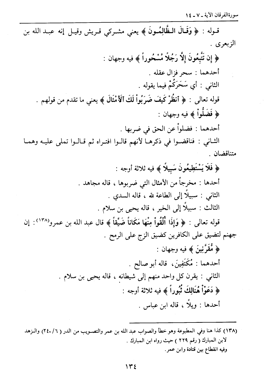 قوله: {وَقَالَ الظَّالِمُونَ} يعني مشركي قريش وقيل إنه عبد الله بن الزبعرى. {إِن تَبَّبِعُونَ إِلاَّ رَجُلاً مَّسْحُوراً} فيه وجهان. أحدهما: سحر فزال عقله. الثاني: أي سَحَرَكُمْ فيما يقوله. قوله تعالى: {انظُرْ كَيفَ ضَرَبُواْ لَكَ الأَمْثَالَ} يعني ما تقدم من قولهم. {فَضَلُّواْ} فيه وجهان: أحدهما: فضلواْ عن الحق في ضربها. الثاني: فناقضوا في ذكرها لأنهم قالوا افتراه ثم قالوا تملى عليه وهما متناقضان. {فَلاَ يَسْتَطِيعُونَ سَبِيلاً} فيه ثلاثة أوجه: أحدها: مخرجاً من الأمثال التي ضربوها , قاله مجاهد. الثاني: سبيلاً إلى الطاعة لله , قاله السدي. الثالث: سبيلاً إلى الخير , قاله يحيى بن سلام. قوله تعالى: {وَإِذَا أُلْقُواْ مِنْهَا مَكَاناً ضَيِّقاً} قال عبد الله بن عمرو: إن جهنم لتضيق على الكافرين كضيق الزج على الرمح. {مُّقَرَّنِينَ} فيه وجهان:: أحدهما: مُكَتَفِينَ , قاله أبو صالح. الثاني: يقرن كل واحد منهم إلى شيطانه , قاله يحيى بن سلام. {دَعَوْاْ هُنَالِكَ ثُبُوراً} فيه ثلاثة أوجه: أحدهما: ويلاً , قاله ابن عباس.