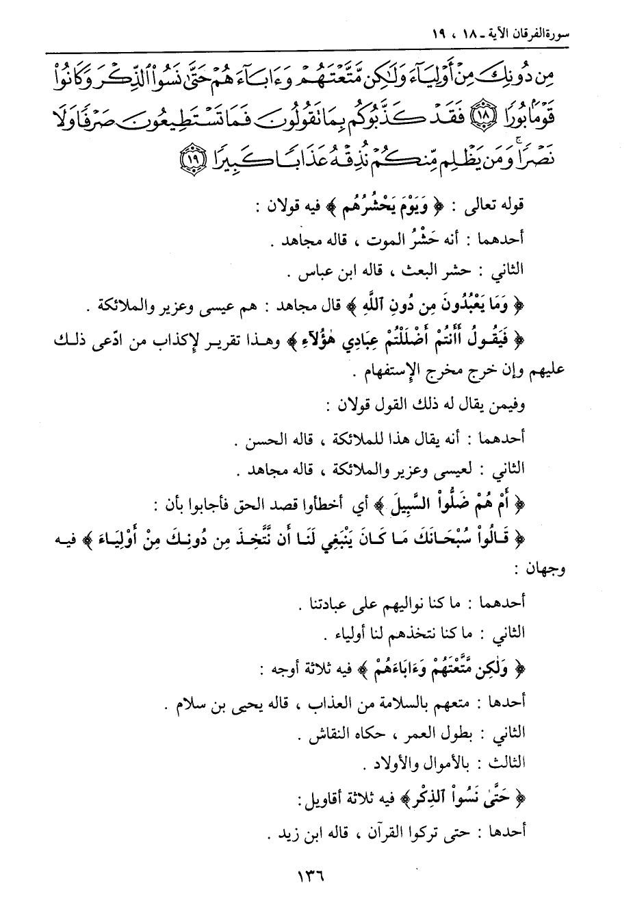 من دونك من أولياء ولكن متعتهم وآباءهم حتى نسوا الذكر وكانوا قوما بورا فقد كذبوكم بما تقولون فما تستطيعون صرفا ولا نصرا ومن يظلم منكم نذقه عذابا كبيرا} قوله تعالى: {وَيَوْمَ يَحْشُرُهُم} فيه قولان: أحدهما أنه حَشْرُ الموت , قاله مجاهد. الثاني: حشر البعث , قاله ابن عباس. {وَمَا يَعْبُدُونَ مِن دُونِ اللَّهِ} قاله مجاهد: هم عيسى وعزير والملائكة. {فَيَقُولُ أَأَنتُمْ أَضْلَلْتُمْ عِبَادِي هؤُلآءِ} وهذا تقرير لإِكذاب من ادّعى ذلك عليهم وإن خرج مخرج الاستفهام. وفيمن قال له ذلك القول قولان: أحدهما أنه يقال هذا للملائكة، قاله الحسن. الثاني: لعيسى وعزير والملائكة , قاله مجاهد. {أَمْ هُمْ ضَلُّواْ السَّبِيلَ} أي أخطأوا قصد الحق بأجابوا بأن {قَالُواْ سُبْحَانَكَ مَا كَانَ يَنْبَغِي لَنَا أَن نَتَّخذَ مِن دُونِكَ مِنْ أَوْلِيآءَ} فيه وجهان: أحدهما ما كنا نواليهم على عبادتنا. الثاني: ما كنا نتخذهم لنا أولياء. {وَلكن مَّتَّعْنَهُمْ وَءَابَاءَهُمْ} فيه ثلاثة أوجه: أحدها: متعهم بالسلامة من العذاب، قاله يحيى بن سلام. الثاني: بطول العمر، حكاه النقاش. الثالث: بالأموال والأولاد. {حَتَّى نَسُواْ الذِكْر} فيه ثلاثة أقاويل: أحدها: حتى تركوا القرآن، قاله ابن زيد.