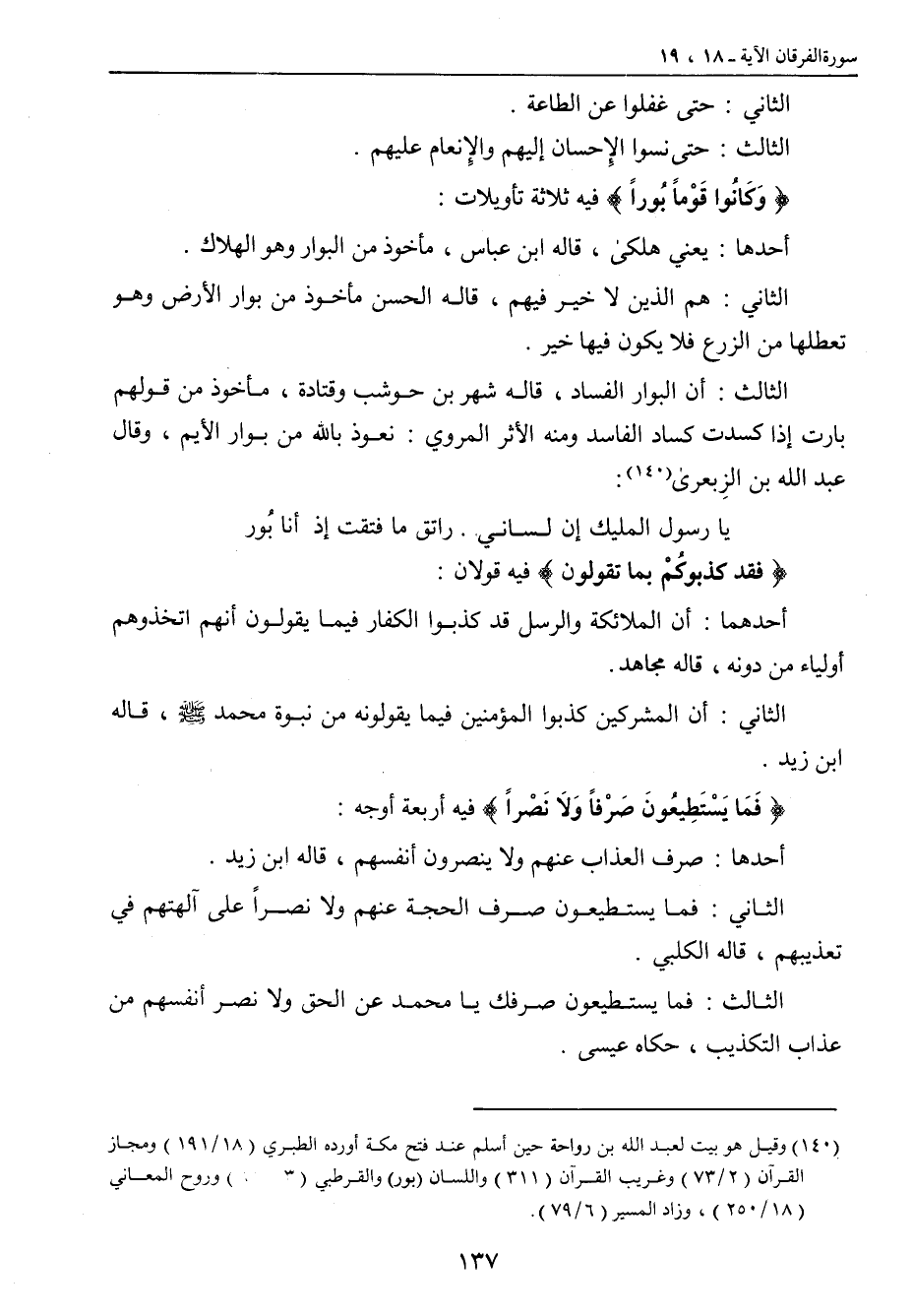 الثاني: حتى غفلوا عن الطاعة. الثالث: حتى نسوا الإِحسان إليهم والإِنعام عليهم. {وََكَانَوا قَوْماً بُوراً} فيه ثلاثة تأويلات: أحدها: يعني هلكى , قاله ابن عباس , مأخوذ من البوار وهو الهلاك. الثاني: هم الذين لا خير فيهم , قاله الحسن مأخوذ من بوار الأرض وهو تعطلها من الزرع فلا يكون فيها خير. الثالث: أن البوار الفساد , قاله شهر بن حوشب وقتادة , مأخوذ من قولهم بارت إذا كسدت كساد الفاسد ومنه الأثر المروي: نعوذ بالله من بوار الأيم , وقال عبد الله بن الزِبعرى: