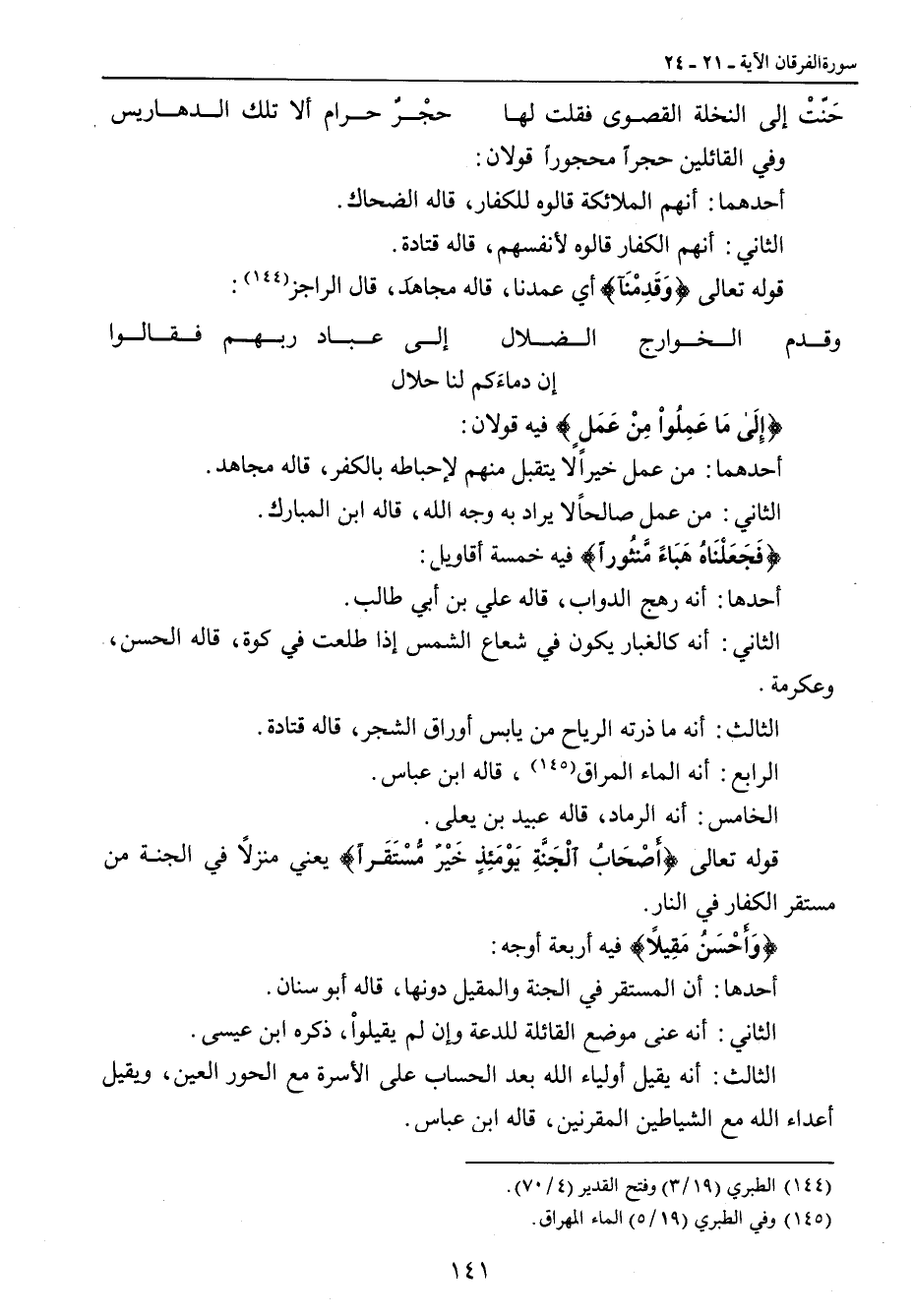 {إِلَى مَا عَمِلُواْ مِنْ عَمَلٍ} فيه قولان: أحدهما: من عمل خيراً لا يتقبل منهم لإِحباطه بالكفر، قاله مجاهد. الثاني: من عمل صالحاً لا يراد به وجه الله , قاله ابن المبارك. {فَجَعَلْنَاهُ هَبَاءً مَّنثُوراً} فيه خمسة أقاويل: أحدها: أنه رهج الدواب , قاله علي بن أبي طالب. الثاني: أنه كالغبار يكون في شعاع الشمس إذا طلعت في كوة , قاله الحسن , وعكرمة. الثالث: أنه ما ذرته الرياح من يابس أوراق الشجر , قاله قتادة. الرابع: أنها الماء المراق، قاله ابن عباس. الخامس: أنه الرماد , قاله عبيد بن يعلى. قوله تعالى: {أَصْحَابُ الْجَنَّةِ يَوْمَئِذٍ خَيْرٌ مُّسْتَقَراً} يعني منزلاً في الجنة من مستقر الكفار في النار. {وَأَحْسَنُ مَقِيلاً} فيه أربعة أوجه: أحدها: أنه المستقر في الجنة والمقيل دونها , قاله أبو سنان. الثاني: أنه عنى موضع القائلة للدعة وإن لم يقيلواْ , ذكره ابن عيسى. الثالث: أنه يقيل أولياء الله بعد الحساب على الأسرة مع الحور العين، ويقيل أعداء الله مع الشياطين المقرنين، قاله ابن عباس.