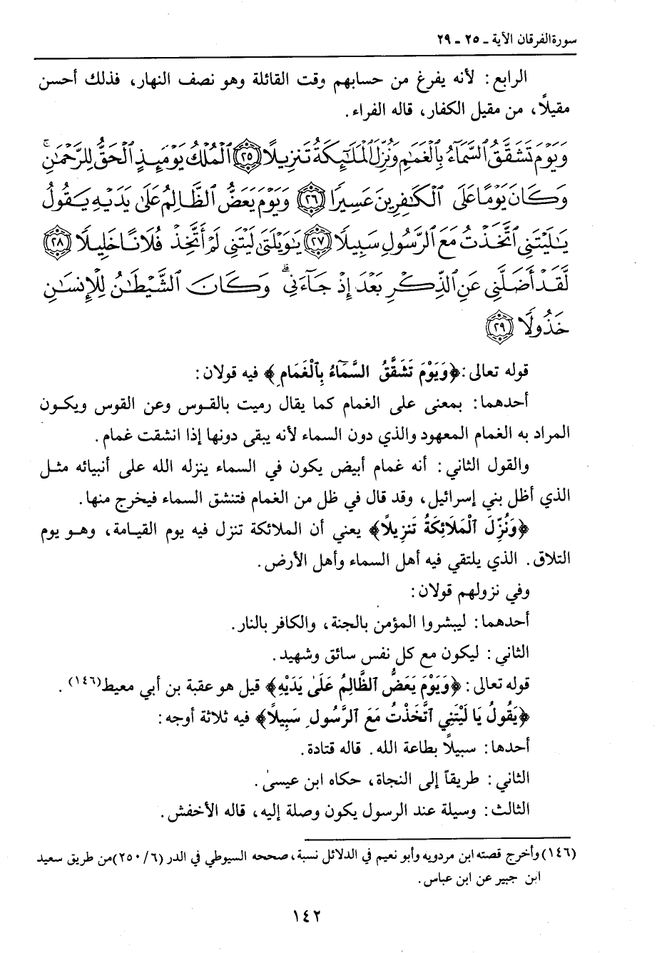{ويوم تشقق السماء بالغمام ونزل الملائكة تنزيلا الملك يومئذ الحق للرحمن وكان يوما على الكافرين عسيرا ويوم يعض الظالم على يديه يقول يا ليتني اتخذت مع الرسول سبيلا يا ويلتى ليتني لم أتخذ فلانا خليلا لقد أضلني عن الذكر بعد إذ جاءني وكان الشيطان للإنسان خذولا} قوله تعالى: {وَيَوْمَ تَشَقَّقُ السَّمَآءُ بِالْغَمَامِ} فيه قولان: أحدهما: بمعنى على الغمام كما يقال رميت بالقوس وعن القوس ويكون المراد به الغمام المعهود والذي دون السماء لأنه يبقى دونها إذا انشقت غمام. والقول الثاني: أنه غمام أبيض يكون في السماء ينزله الله على أنبيائه مثل الذي أظل بني إسرائيل , وقد قال في ظل من الغمام فتنشق السماء فيخرج منها. {وَنُزِّلَ الْمَلاَئِكَةُ تَنزِيلاً} يعني أن الملائكة تنزل فيه يوم القيامة , وهو يوم التلاق. الذي يلتقي فيه أهل السماء وأهل الأرض. وفي نزولهم قولان: أحدهما: ليبشروا المؤمن بالجنة , والكافر بالنار. الثاني: ليكون مع كل نفس سائق وشهيد. قوله تعالى: {وَيَوْمَ يَعَضُّ الظَّالِمُ عَلَى يَدَيْهِ} قيل هو عقبة بن أبي معيط. {يَقُولُ يَا لَيْتَنِي اتَّخَذْتُ مَعَ الرَّسُولِ سَبِيلاً} فيه ثلاثة أوجه: أحدها: سبيلاً بطاعة الله , قاله قتادة. الثاني: طريقاً إلى النجاة , حكاه ابن عيسى. الثالث: وسيلة عند الرسول يكون وصلة إليه، قاله الأخفش.