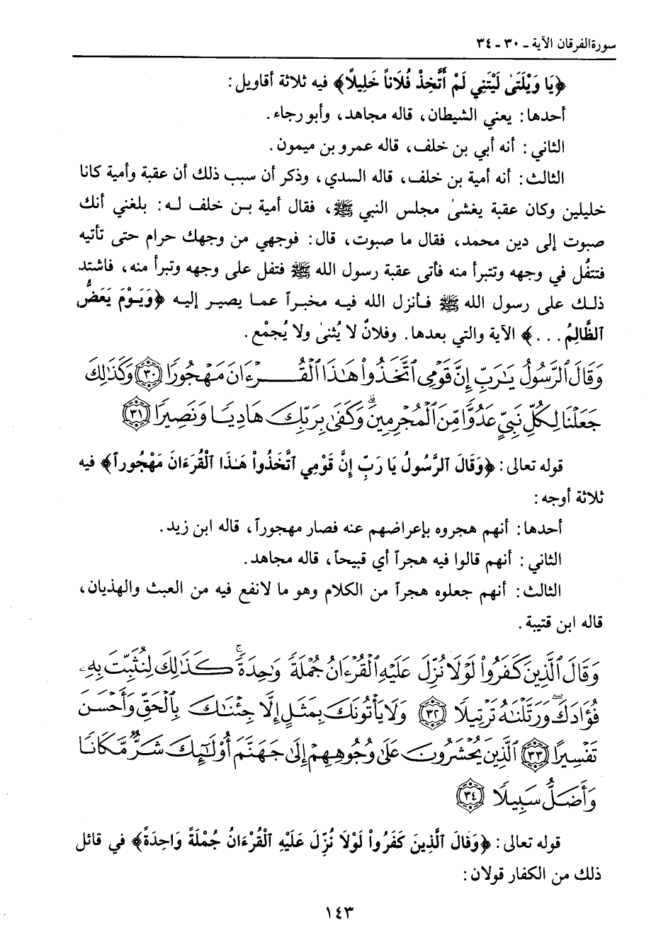 {يَا وَيْلَتِي لَيْتَنِي لَمْ أَتَّخِذْ فُلاَناً خَلِيلاً} فيه ثلاثة أقاويل: أحدها: يعني الشيطان , قاله مجاهد , وأبو رجاء. الثاني: أنه أبي بن خلف , قاله عمرو بن ميمون. الثالث: أنه أمية بن خلف , قاله السدي , وذكر أن سبب ذلك أن عقبة وأمية كانا خليلين وكان عقبة يغشى مجلس النبي صلى الله عليه وسلم , فقال أمية بن خلف له: بلغني أنك صبوت إلى دين محمد , فقال ما صبوت , قال: فوجهي من وجهك حرام حتى تأتيه فتتفُل في وجهه وتتبرأ منه فأتى عقبة رسول الله صلى الله عليه وسلم فتفل على جهه وتبرأ منه , فاشتد ذلك على رسول الله صلى الله عليه وسلم فأنزل الله فيه مخبراً عما يصير إليه {وَيَوْمَ يَعَضُّ الظَّالمُ ... } الآية والتي بعدها. وفلانٌ لا يُثنى ولا يُجمْع.
