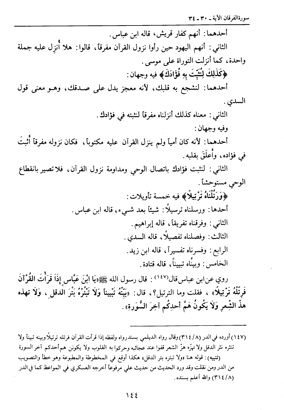 أحدهما: أنهم كفار قريش , قاله ابن عباس. الثاني: أنهم اليهود حين رأوا نزول القرآن مفرقاً , قالوا: هلا أُنزِل عليه جملة واحدة , كما أنزلت التوراة على موسى. {كَذلِكَ لِنُثَبِّتَ بِهِ فُؤَادَكَ} فيه وجهان: أحدهما: لنشجع به قلبك , لأنه معجز يدل على صدقك , وهو معنى قول السدي. الثاني: معناه كذلك أنزلناه مفرقاً لنثبته في فؤادك. وفيه وجهان: أحدهما: لأنه كان أمياً ولم ينزل القرآن عليه مكتوباً , فكان نزوله مفرقاً أَثبتَ في فؤاده , وأَعلَقَ بقلبه. الثاني: لنثبت فؤادك باتصال الوحي ومداومة نزول القرآن، فلا تصير بانقطاع الوحي مستوحشاً. {وَرَتَّلْنَاهُ تَرْتِيلاً} فيه خمسة تأويلات: أحدها: ورسلناه ترسيلاً، شيئاً بعد شيء، قاله ابن عباس. الثاني: وفرقناه تفريقاً، قاله إبراهيم. الثالث: وفصلناه تفصيلاً، قاله السدي. الرابع: وفسرناه تفسيراً، قاله ابن زيد. الخامس: وبينَّاه تبييناً، قاله قتادة. روي عن ابن عباس قال: قال رسول الله صلى الله عليه وسلم: (يَا ابْنَ عَبَّاسِ إِذَا قَرَأْتَ القُرْآنَ فَرِتّلْهُ تَرْتِيلاً) فقلت وما الترتيل؟، قال: (بَيِّنْهُ تَبْييناً وَلاَ تَبْتُرْهُ بَتْرَ الدقلِ، وَلاَ تهذه هذّ الشِّعرِ وَلاَ يَكُونُ هَمَّ أَحدِكُم آخِرَ السُّورَةِ).