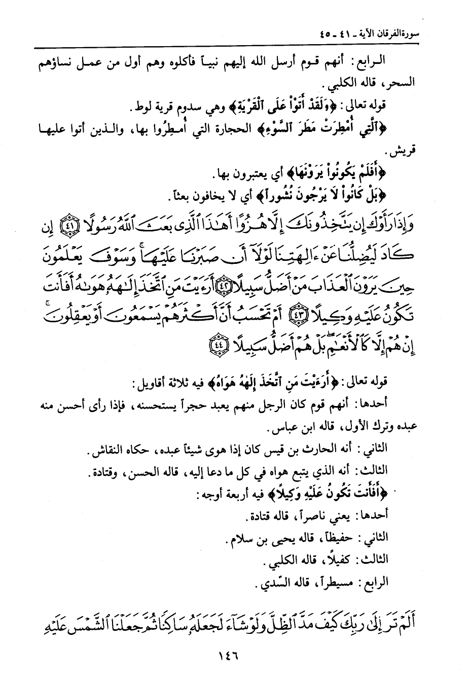 الرابع: أنهم قوم أرسل الله إليهم نبياً فأكلوه وهم أول من عمل نساؤهم السحر، قاله الكلبي. قوله تعالى: {وَلَقَدْ أَتَوْاْ عَلَى الْقَرْيَةِ} وهي سدوم قرية لوط. {الَّتِي أُمْطِرَتْ مَطَرَ السَّوْءٍ} الحجارة التي أُمطِرُوا بها , والذين أتوا عليها قريش. {أَفَلَمْ يَكُونُواْ يَرَوْنَهَا} أي يعتبرون بها. {بَلْ كَانُواْ لاَ يَرْجُونَ نَشُوراً} أي لا يخافون بعثاً.
