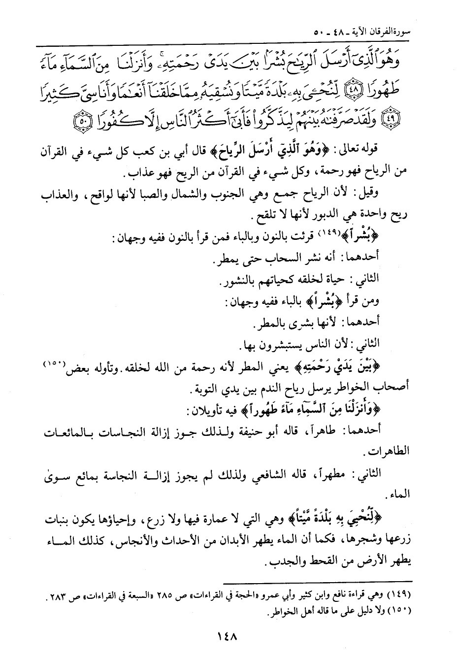 {وهو الذي أرسل الرياح بشرا بين يدي رحمته وأنزلنا من السماء ماء طهورا لنحيي به بلدة ميتا ونسقيه مما خلقنا أنعاما وأناسي كثيرا ولقد صرفناه بينهم ليذكروا فأبى أكثر الناس إلا كفورا} قوله تعالى: {وَهُوَ الَّذِي أَرْسَلَ الرِّياحَ} قال أبي بن كعب كل شيء في القرآن من الرياح فهو رحمة , وكل شيء في القرآن من الريح فهو عذاب. وقيل: لأن الرياح جمع وهي الجنوب والشمال والصبا لأنها لواقح , والعذاب ريح واحدة وهي الدبور لأنها لا تلقح. {بُشْراً} قرئت بالنون وبالباء فمن قرأ بالنون ففيه وجهان: أحدهما: أنه نشر السحاب حتى يمطر. الثاني: حياة لخلقه كحياتهم بالنشور. ومن قرأ {بُشْراً} بالباء ففيه وجهان: أحدهما لأنها بشرى بالمطر. الثاني: لأن الناس يستبشرون بها. {بَيْنَ يَدَيْ رَحْمَتِهِ} يعني المطر لأنه رحمة من الله لخلقه , وتأوله بعض أصحاب الخواطر يرسل رياح الندم بين يدي التوبة. {وَأَنزَلْنَا السَّمِآءِ مَآءً طَهُوراً} فيه تأويلان: أحدهما: طاهراً , قاله أبو حنيفة ولذلك جوز إزالة النجاسات بالمائعات الطاهرات. الثاني: مطهراً , قاله الشافعي ولذلك لم يجوز إزالة النجاسة بمائع سوى الماء. {لِّنُحْيِيَ بِهِ بَلْدَةً مَّيْتاً} وهي التي لا عمارة فيها ولا زرع، وإحياؤها يكون بنبات زرعها وشجرها، فكما أن الماء يطهر الأبدان من الأحداث والأنجاس، كذلك الماء يطهر الأرض من القحط والجدب.