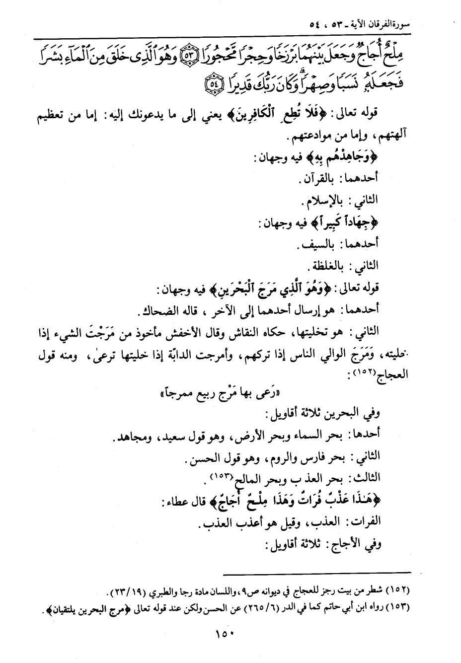 ملح أجاج وجعل بينهما برزخا وحجرا محجورا وهو الذي خلق من الماء بشرا فجعله نسبا وصهرا وكان ربك قديرا} قوله تعالى: {فَلاَ تُطِعِ الْكَافِرِينَ} يعني إلى ما يدعونك إليه: إما من تعظيم آلهتهم , وإما من موادعتهم. {وَجَاهِدْهُم بِهِ} فيه وجهان: أحدهما: بالقرآن. الثاني: بالإِسلام. {جِهَاداً كَبِيراً} فيه وجهان: أحدهما: بالسيف. الثاني: بالغلظة. قوله تعالى: {وَهُوَ الَّذِي مَرَجَ الْبَحْرَينِ} فيه وجهان: أحدهما: هو إرسال أحدهما إلى الآخر , قاله الضحاك. الثاني: هو تخليتها , حكاه النقاش وقال الأخفش مأخوذ من مَرَجْتَ الشيء إذا خليته , وَمَرَجَ الوالي الناس إذا تركهم , وأمرجت الدابّة إذا خليتها ترعى , ومنه قول العجاج.
