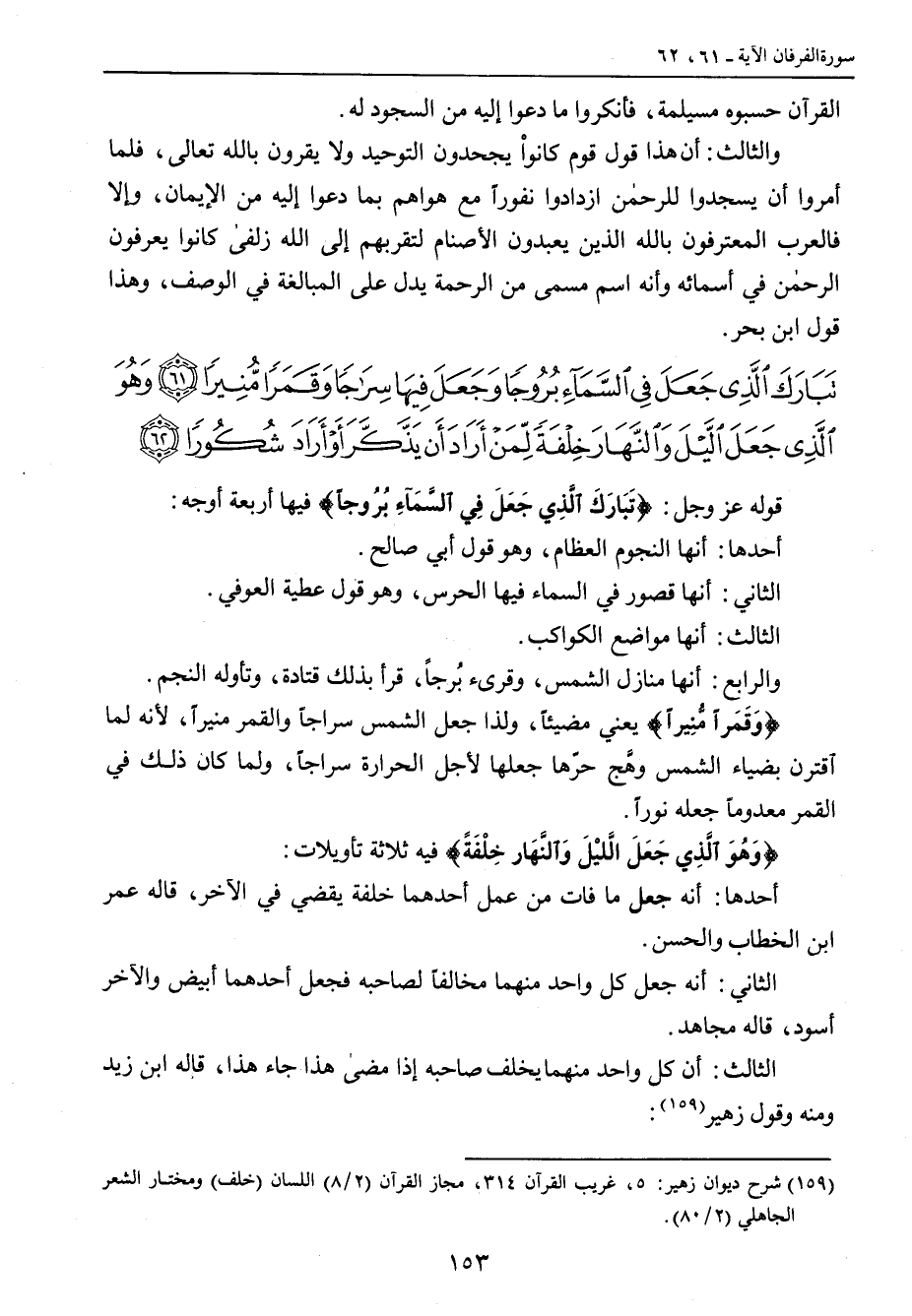 {تبارك الذي جعل في السماء بروجا وجعل فيها سراجا وقمرا منيرا وهو الذي جعل الليل والنهار خلفة لمن أراد أن يذكر أو أراد شكورا} قوله عز وجل: {تَبَارَكَ الَّذِي جَعَلَ فِي السَّمَآءِ بُرُوجاً} فيها أربعة أوجه: أحدها: أنها النجوم العظام , وهو قول أبي صالح. الثاني: أنها قصور في السماء فيها الحرس , وهو قول عطية العوفي. الثالث: أنها مواضع الكواكب. والرابع: أنها منازل الشمس، وقرىء بُرجاً، قرأ بذلك قتادة , وتأوله النجم. {وَقَمَراً مُّنِيراً} يعني مضيئاً، ولذا جعل الشمس سراجاً والقمر منيراً، لأنه لما اقترن بضياء الشمس وهَّج حرّها جعلها لأجل الحرارة سراجاً، ولما كان ذلك في القمر معدوماً جعله نوراً. {وَهُوَ الَّذِي جَعَلَ اللَّيْلَ وَالنَّهَار خِلْفَةً} فيه ثلاثة تأويلات: أحدها: أنه جعل ما فات من عمل أحدهما خلفة يقضي في الآخر، قاله عمر ابن الخطاب والحسن. الثاني: أنه جعل كل واحد منهما مخالفاً لصاحبه فجعل أحدهما أبيض والآخر أسود , قاله مجاهد. الثالث: أن كل واحد منهما يخلف صاحبه إذا مضى هذا جاء هذا , قاله ابن زيد ومنه قول زهير: