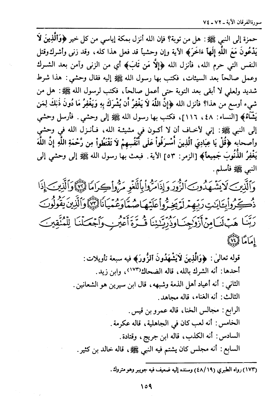 {والذين لا يشهدون الزور وإذا مروا باللغو مروا كراما والذين إذا ذكروا بآيات ربهم لم يخروا عليها صما وعميانا والذين يقولون ربنا هب لنا من أزواجنا وذرياتنا قرة أعين واجعلنا للمتقين إماما} قوله تعالى: {وَالَّذِينَ لاَ يَشْهَدُونَ الزُّورَ} فيه سبعة تأويلات: أحدها: أنه الشرك بالله , قاله الضحاك، وابن زيد. الثاني: أنه أعياد أهل الذمة وشبهه، قال ابن سيرين هو الشعانين. الثالث: أنه الغناء , قاله مجاهد. الرابع: مجالس الخنا، قاله عمرو بن قيس. الخامس: أنه لعب كان في الجاهلية، قاله عكرمة. السادس: أنه الكذب، قاله ابن جريج، وقتادة. السابع: أنه مجلس كان يشتم فيه النبي صلى الله عليه وسلم، قاله خالد بن كثير.
