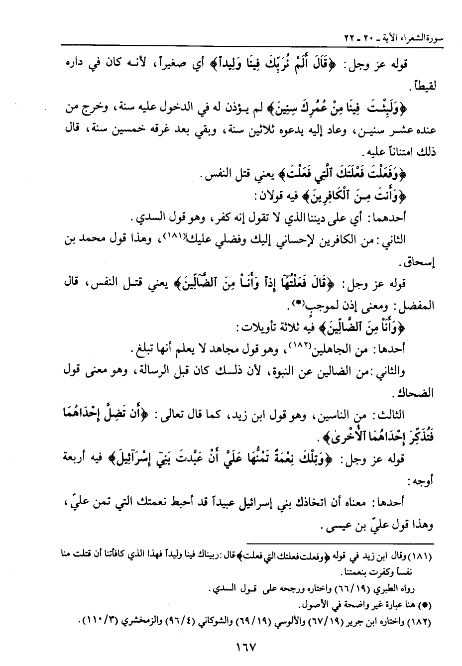 قوله عز وجل: {قَاَلَ أَلَمْ نُرَبِّكَ فِينَا وَلِيداً} أي صغيراً , لأنه كان في داره لقيطاً. {وَلَبِثْتَ فِينَا مِنْ عُمُرِكَ سِنِينَ} لم يؤذن له في الدخول عليه سنة , وخرج من عنده عشر سنين , وعاد إليه يدعوه ثلاثين سنة , وبقي بعد غرقه خمسين سنة , قال ذلك امتناناً عليه. {وَفَعَلْتَ فَعْلَتَكَ الَّتِي فَعَلْتَ} يعني قتل النفس. {وَأَنتَ مِنَ الْكَافِرِينَ} فيه قولان: أحدهما: أي على ديننا الذي لا تقول إنه كفر , وهو قول السدي. الثاني: من الكافرين لإحساني إليك وفضلي عليك , وهذا قول محمد بن إسحاق. قوله عز وجل: {قَالَ فَعَلْتُهَآ إِذاً وَأَنَاْ مِنَ الضَّآلِينَ} يعني قتل النفس , قال المفضل: ومعنى إذن لموجبٍ. {وَأَنَاْ مِنَ الضَّآلِينَ} فيه ثلاثة تأويلات: أحدها: من الجاهلين , وهو قول مجاهد لا يعلم أنها تبلغ. والثاني: من الضالين عن النبوة , لأن ذلك كان قبل الرسالة، وهو معنى قول الضحاك. الثالث: من الناسين، وهو قول ابن زيد، كما قال تعالى: {أَن تَضِلَّ إِحْدَاهُمَا فَتُذَكِّرَ إِحْدَاهُمَا الأُخْرَى}. قوله عز وجل: {وَتِلْكَ نِعْمَةٌ تَمْنُّهَا عَلَيَّ أَنْ عَبَّدتَ بَنِي إِسْرَائِيلَ} فيه أربعة أوجه: أحدها: معناه أن اتخاذك بني إسرائيل عبيداً قد أحبط نعمتك التي تمن عليّ، وهذا قول عليّ بن عيسى.