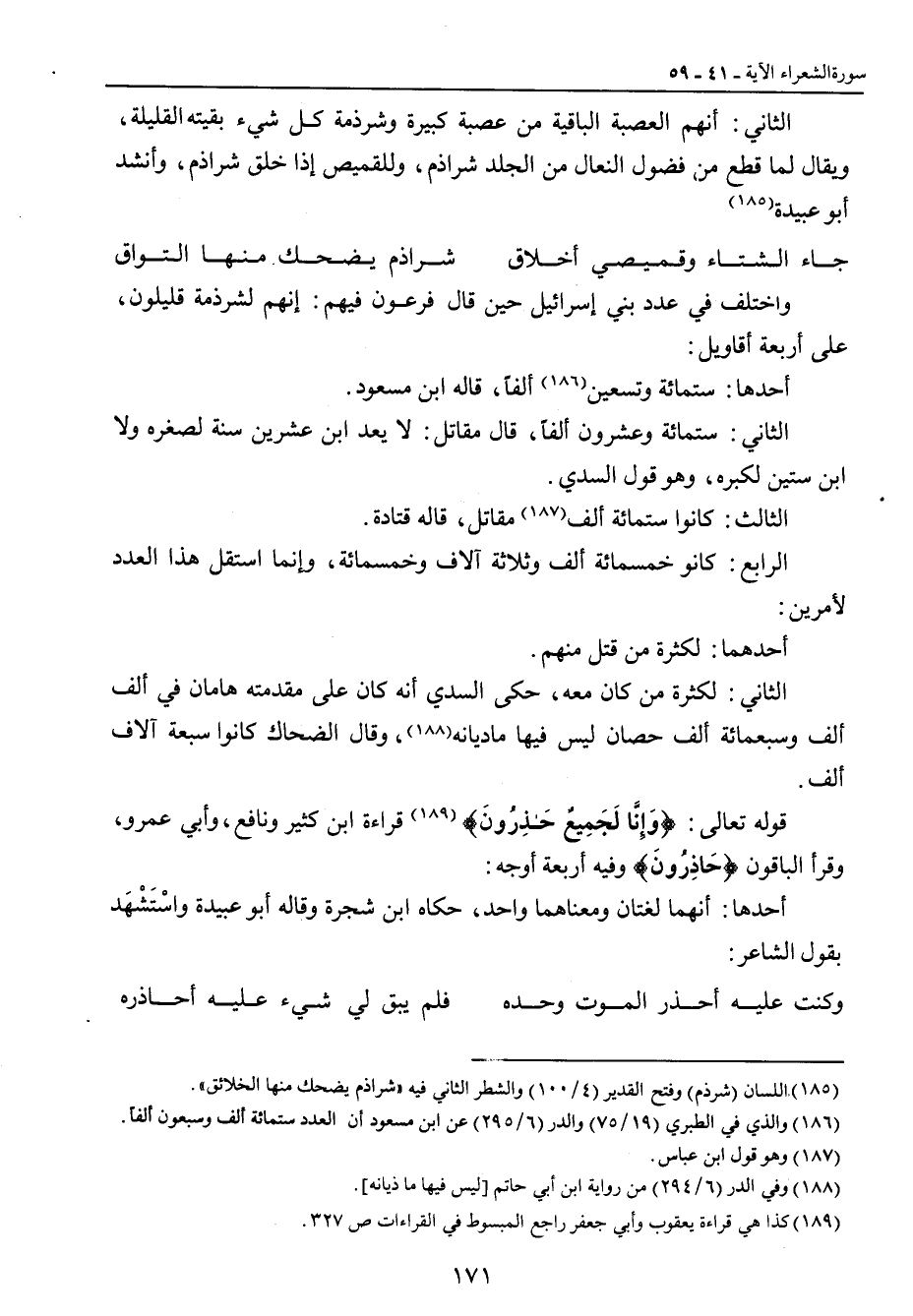 واختلف في عدد بني إسرائيل حين قال فرعون فيهم: إنه لشرذمة قليلون , على أربعة أقاويل: أحدها: ستمائة وتسعين ألفاً , قال مقاتل: لا يعد ابن عشرين سنة لصغيره ولا ابن ستين لكبره , وهو قول السدي. الثالث: كانوا ستمائة ألف مقاتل , قاله قتادة. الرابع: كانوا خمسمائة ألف وثلاثة آلاف وخمسمائة , وإنما استقل هذا العدد لأمرين: أحدهما: لكثرة من قتل منهم. الثاني: لكثرة من كان معه , حكى السدي أنه كان على مقدمته هامان في ألف ألف وسبعمائة ألف حصان ليس فيها ماديانه , وقال الضحاك كانوا سبعة آلاف ألف. قوله تعالى: {وَإِنَّا لَجَمِيعٌ حَذِرُونَ} قراءة ابن كثير ونافع , وأبي عمرو , وقرأ الباقون {حَاذِرُونَ} وفيه أربعة أوجه: أحدها: أنهما لغتان ومعناهما واحد , حكاه ابن شجرة وقاله أبو عبيدة واسْتَشْهَد بقول الشاعر: