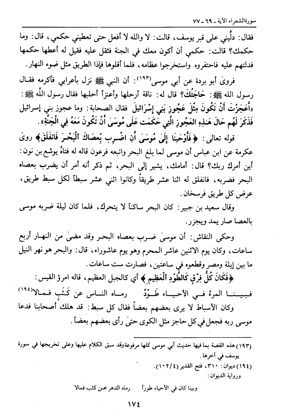 فقال: دلِّيني على قبر يوسف , قالت: لا والله لا أفعل حتى تعطيني حكمي , قال: وما حكمك؟ قالت: حكمي أن أكون معك في الجنة فثقل عليه فقيل له أعطاها حكمها فدلتهم عله فاحتفروه واستخرجوا عظامه , فلما ألقوها فإذا الطريق مثل ضوء النهار. فروى أبو بردة عن أبي موسى: أن النبي صلى الله عليه وسلم نزل بأعرابي فأكرمه فقال رسول الله صلى الله عليه وسلم: (حَاجَتُكَ) قاله له: ناقة أرحلها وأعنزاً أحلبها فقال رسول الله صلى الله عليه وسلم: (أَعَجَزْتَ أَنْ تَكُونَ مِثْلَ عَجُوزِ بَنِي إِسْرَائيلَ) فقال الصحابة: وما عجوز بني إسرائيل فَذَكَرَ لَهُم حَالَ هَذِهِ العَجُوزِ الَّتِي حَكَمَت عَلَى مُوسَى أَنْ تَكُونَ مَعَهُ فِي الْجَنَّةِ. قوله تعالى: {فأَوْحَيْنَا إِلَى مُوسَى أَنِ اضْرِب بِّعَصَاكَ الْبَحْرَ فَانفَلَقَ} روى عكرمة عن ابن عباس أن موسى لما بلغ البحر واتبعه فرعون قاله له فتاهُ يوسع بن نون: أين أمرك ربك؟ قال: أمامك , يشير إلى البحر , ثم ذكر أنه أمر أن يضرب بعصاه البحر فضربه , فانفلق له اثنا عشر طريقاً وكانوا اثني عشر سبطاً لكل سبط طريق , عرض كل طريق فرسخان. وقال سعيد بن جبير: كان البحر ساكناً لا يتحرك , فلما كان ليلة ضربه موسى بالعصا صار يمد ويجزر. وحكى النقاش: أن موسى ضرب بعصاه البحر وقد مضى من النهار أربع ساعات , وكان يوم الاثنين عاشر المحرم وهو يوم عاشوراء , قال: والبحر هو نهر النيل ما بين إيلة ومصر وقطعوه في ساعتين , فصارت ست ساعات. {فَكَانَ كُلُّ فِرْقٍ كَالطَّوْدِ الْعَظِيمِ} أي كالجبل العظيم , قاله امرؤ القيس:
