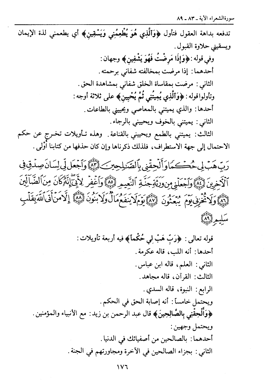 {رب هب لي حكما وألحقني بالصالحين واجعل لي لسان صدق في الآخرين واجعلني من ورثة جنة النعيم واغفر لأبي إنه كان من الضالين ولا تخزني يوم يبعثون يوم لا ينفع مال ولا بنون إلا من أتى الله بقلب سليم} قوله تعالى: {رَبِّ هَبْ لِي حُكْماً} فيه أربعة تأويلات: أحدها: أنه اللب , قاله عكرمة. الثاني: العلم , قاله ابن عباس. الثالث: القرآن , قاله مجاهد. الرابع: النبوة , قاله السدي. ويحتمل خامساً: أنه إصابة الحق في الحكم. {وَأَلْحِقْنِي بِالصَّالِحِينَ} قال عبد الرحمن بن زيد: مع الأنبياء والمؤمنين. ويحتمل وجهين: أحدهما: بالصالحين من أصفيائك في الدنيا. الثاني: بجزاء الصالحين في الآخرة ومجاورتهم في الجنة.