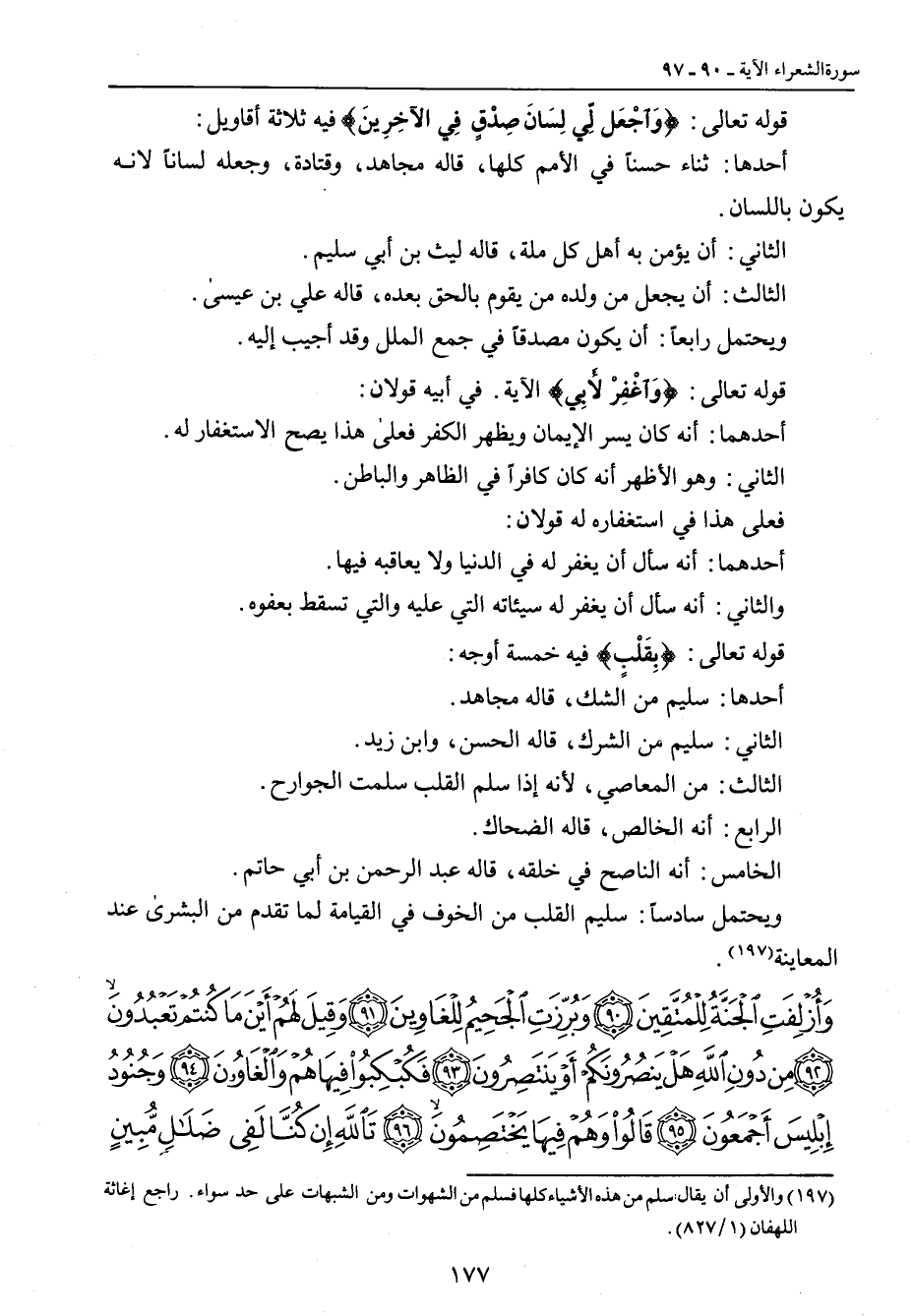 قوله تعالى: {وَاجْعَل لِّي لِسَانَ صِدْقٍ فِي الآخِرِينَ} فيه ثلاثة أقاويل: أحدها: ثناء حسناً في الأمم كلها , قاله مجاهد , وقتادة , وجعله لساناً لأنه يكون باللسان. الثاني: أن يؤمن به أهل كل ملة , قاله ليث بن أبي سليم. الثالث: أن يجعل من ولده من يقول بالحق بعده , قاله علي بن عيسى. ويحتمل رابعاً: أن يكون مصدقاً في جمع الملل وقد أجيب إليه. قوله تعالى: {وَاغْفِرْ لأَبِي} الآية. في أبيه قولان: أحدهما: أنه كان يسر الإيمان ويظهر الكفر فعلى هذا يصح الاستغفار له. الثاني: وهو الأظهر أنه كان كافراً في الظاهر والباطن. فعلى هذا في استغفاره له قولان: أحدهما: أنه سأل أن يغفر له في الدنيا ولا يعاقبه فيها. والثاني: أنه سأل أن يغفر له سيئاته التي عليه والتي تسقط بعفوه. قوله تعالى: {بِقَلْبٍ} فيه خمسة أوجه: أحدها: سليم من الشك , قاله مجاهد. الثاني: سليم من الشرك , قاله الحسن , وابن زيد. الثالث: من المعاصي , لأنه إذا سلم القلب سلمت الجوارح. الرابع: أنه الخالص , قاله الضحاك. الخامس: أنه الناصح في خلقه , قاله عبد الرحمن بن أبي حاتم. ويحتمل سادساً: سليم القلب من الخوف في القيامة لما تقدم من البشرى عند المعاينة.