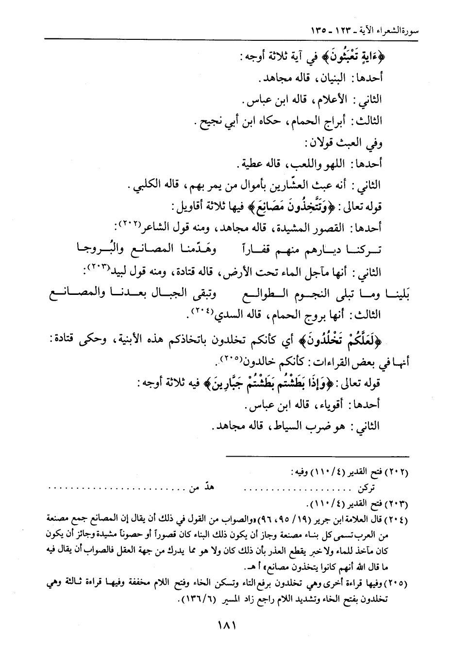 {ءَايةٍ تَعْبَثُونَ} في آية ثلاثة أوجه: أحدها: البنيان , قاله مجاهد. الثاني: الأعلام , قاله ابن عباس. الثالث: أبراج الحمام , حكاه ابن أبي نجيح. وفي العبث قولان: أحدها: اللهو واللعب , قاله عطية. الثاني: أنه عبث العشّارين بأموال من يمر بهم , قاله الكلبي. قوله تعالى: {وَتَتَّخِذُونَ مَصَانِعَ} فيها ثلاثة أقاويل: أحدها: القصور المشيدة , قاله مجاهد , ومنه قول الشاعر: